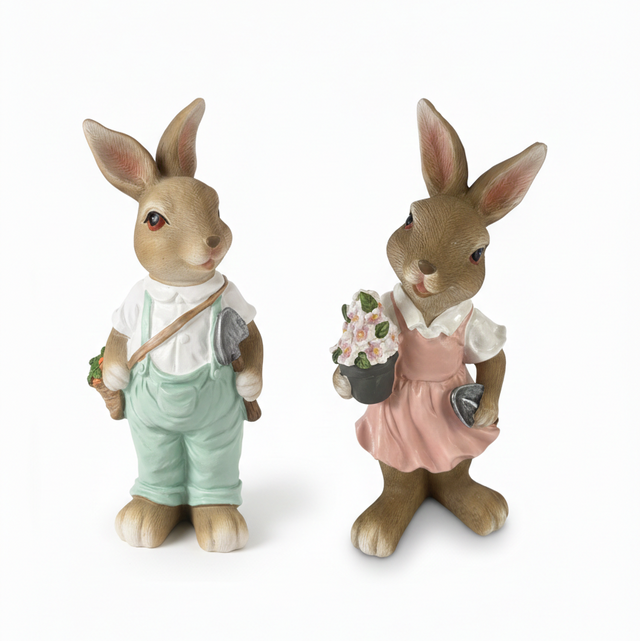 Coppia di conigli decorativi in resina modello Coniglietto Giardiniere, raffigurati in una dolce scena primaverile con attrezzi da giardino e vasetto di fiori. I colori pastello e i dettagli curati richiamano l’atmosfera romantica e fresca della primavera, perfetta per allestimenti pasquali eleganti e accoglienti.