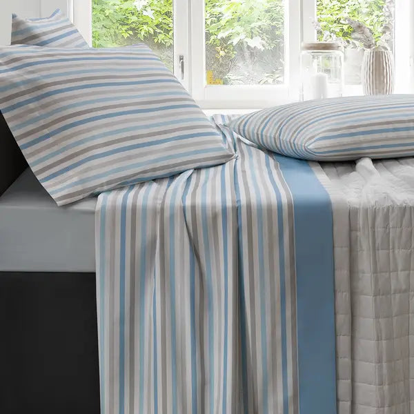 Completo Lenzuolo Kos - Intramontabile geometrico con Kos, il nuovo completo lenzuolo della collezione Sprint di VallesusaCasa.Stampato su tela di puro cotone 58 fili cmq, è composto da federe, lenzuolo sopra con bordo tinta unita e sottolenzuolo con angoli da cm 28 che lo rendono adatto anche ai moderni materassi.