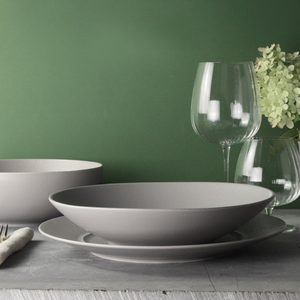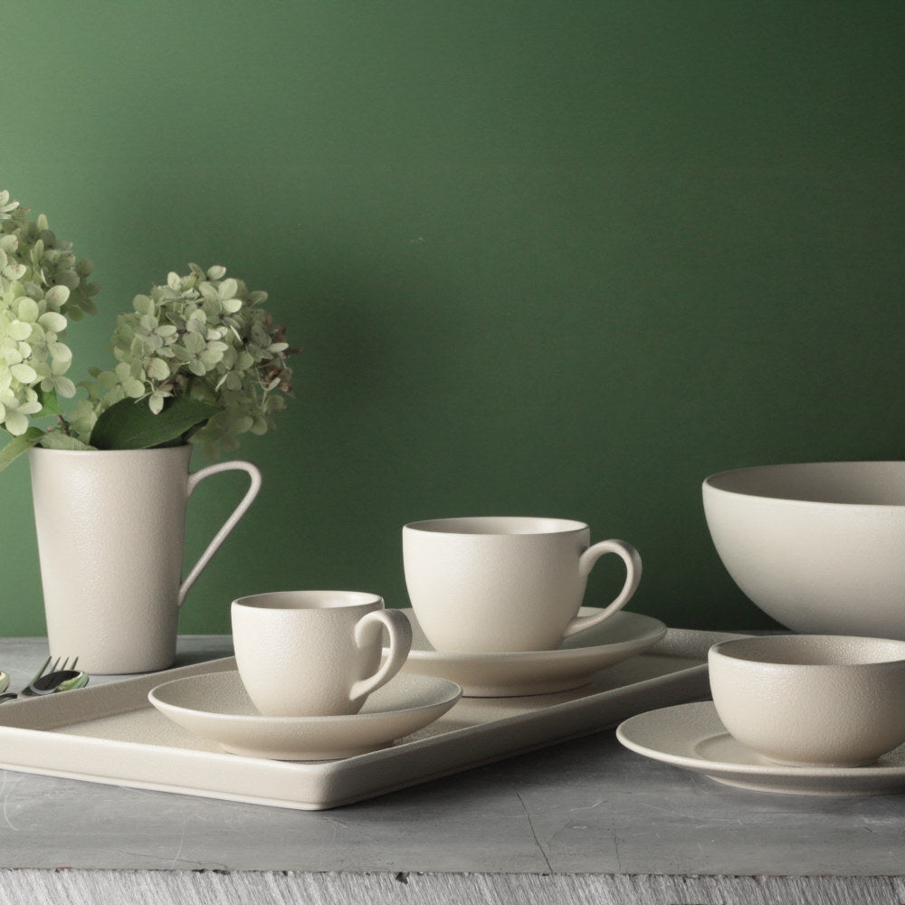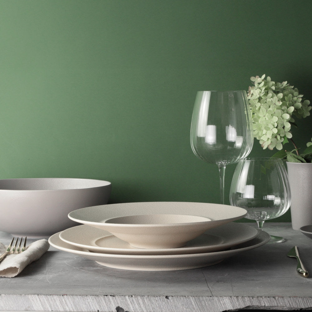 Un particolare smalto effetto pietra riveste i piatti e gli accessori della linea Terrea Sand, resistente e materica, per un pranzo non solo da assaporare, ma anche da toccare e da apprezzare al tatto. L'effetto granito continua anche all'interno dei piatti, che diventano così veri pezzi unici protagonisti della tavola.