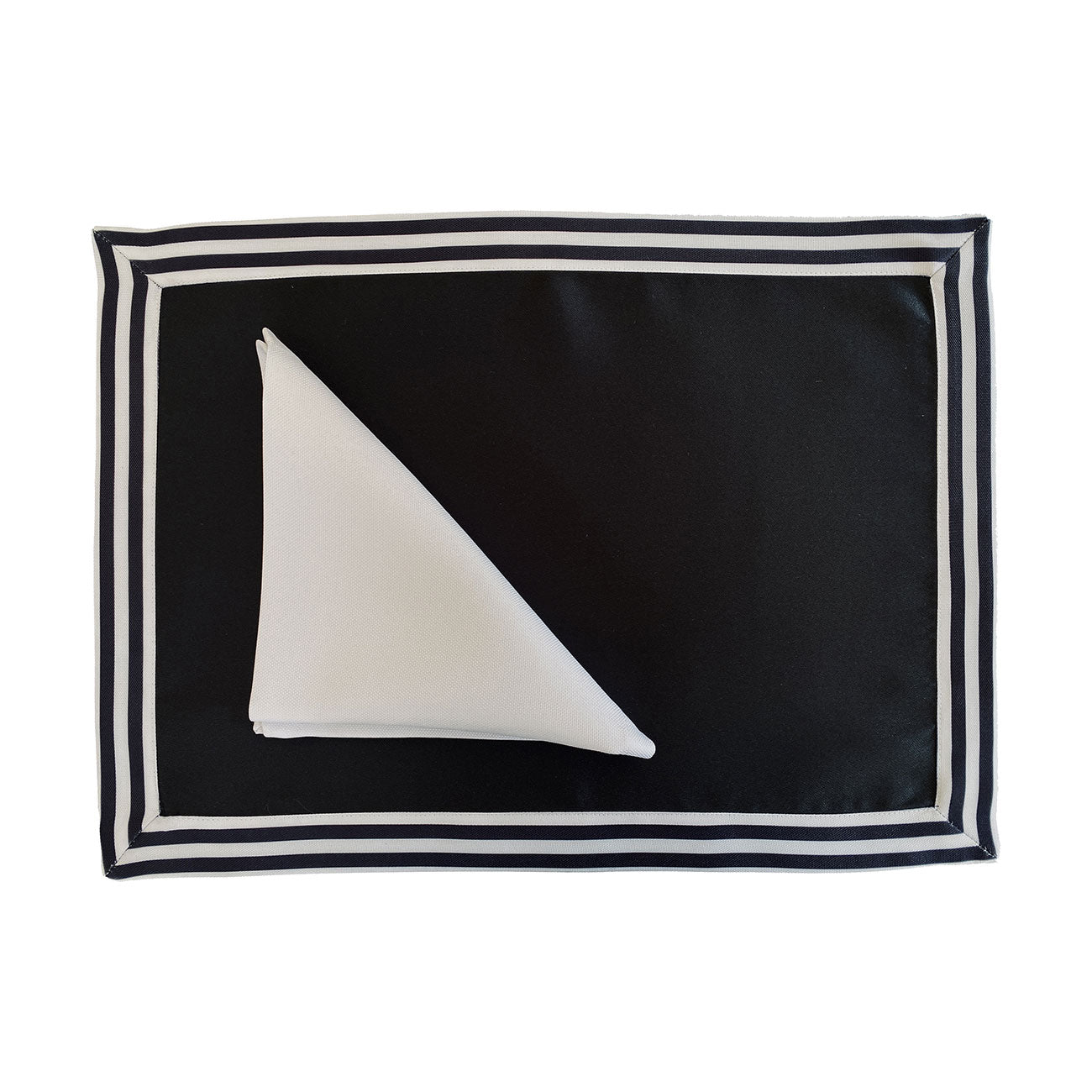 Nuova tovaglietta black antimacchia e antistiro rifinita con bordo a righe bianche e nere. Estremamente versatile nei suoi utilizzi, pensata non solo per la colazione, ma anche per pranzi e cene informali.