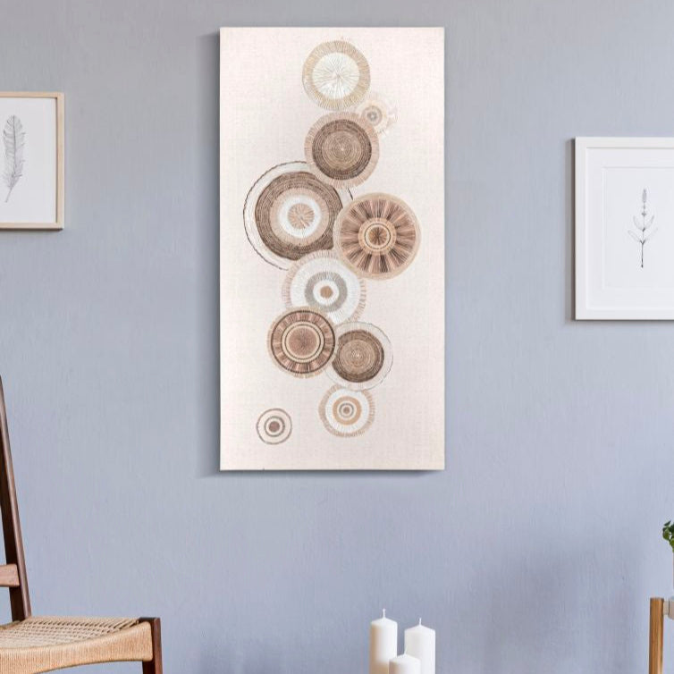 Complemento d’arredo moderno ed elegante, perfetto per arricchire pareti con stile minimal e contemporaneo. La composizione astratta di cerchi intrecciati in tonalità naturali e neutre crea un effetto armonioso e raffinato, facilmente abbinabile a diversi contesti abitativi. Ideale per soggiorni, camere da letto, ingressi o uffici, dona equilibrio e personalità agli spazi.