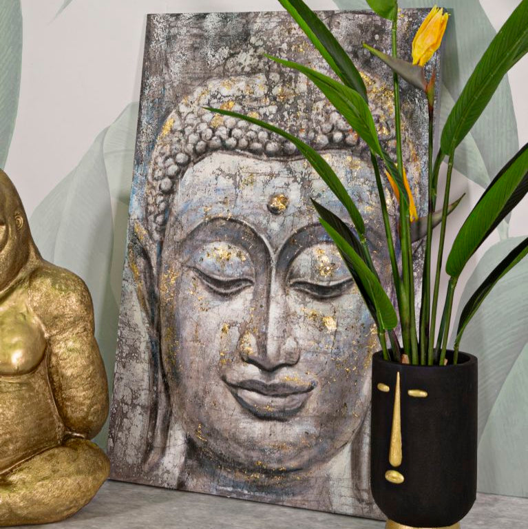 Un’opera dal forte impatto decorativo, ideale per chi desidera creare un’atmosfera di armonia e meditazione in casa. Raffigura il volto del Buddha con espressione serena, realizzato con tonalità neutre e arricchito da dettagli dorati che conferiscono luminosità e profondità. Perfetto per soggiorni, studi, ingressi o angoli dedicati al relax, si adatta ad ambienti moderni, etnici e zen.