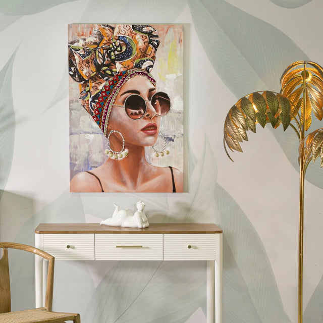 Un’opera dal fascino contemporaneo ed etnico, perfetta per dare carattere e personalità alle pareti di casa. Raffigura una donna elegante con occhiali dorati, turbante colorato e grandi orecchini, dettagli impreziositi da lavorazioni materiche che donano luminosità e profondità. Ideale per soggiorni, ingressi o ambienti moderni, aggiunge un tocco di energia e raffinatezza all’arredo.