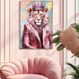 Dipinto su tela dai toni rosa con cornice in metallo dorato e telaio in legno. Leone che indossa una corona da re, stile elegante e regale, perfetto per arricchire qualsiasi ambiente con un tocco di maestosità. Con applicazioni in rilievo.