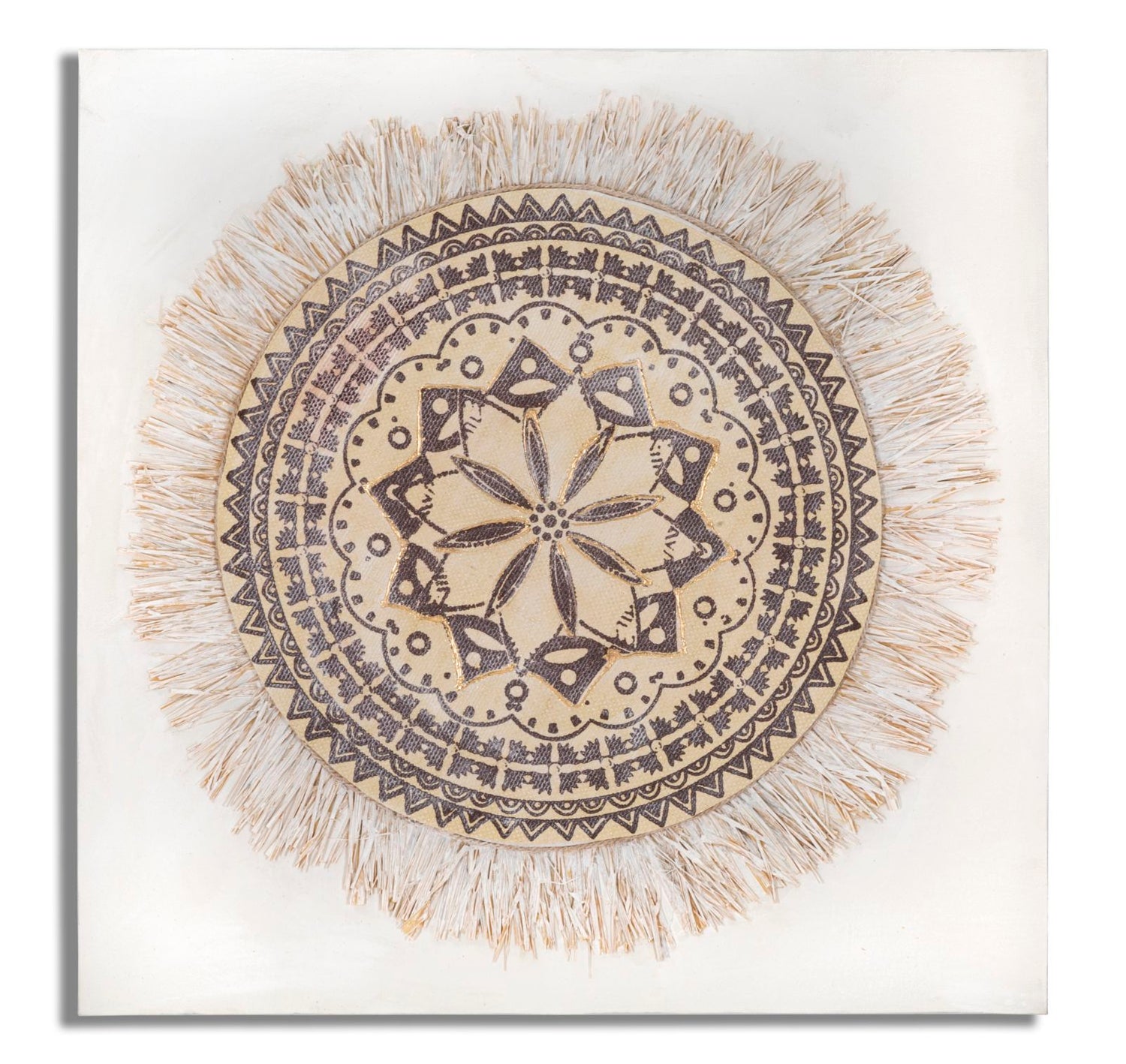 Porta armonia ed equilibrio negli ambienti grazie al suo design ispirato ai motivi etnici e naturali. Il grande mandala centrale, realizzato con dettagli in rilievo e sfumature nei toni del beige, marrone e avorio, è incorniciato da una texture che richiama la fibra naturale, rendendo l’opera calda ed elegante. Perfetto per soggiorni, ingressi, camere da letto o spazi arredati in stile boho chic e naturale.