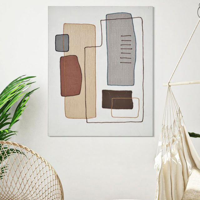 Un’opera moderna che unisce linee essenziali e forme geometriche dai toni caldi e neutri, creando un effetto elegante e sofisticato. Le texture in rilievo valorizzano la composizione, rendendola un complemento d’arredo raffinato e originale. Perfetto per dare personalità a soggiorni, camere da letto o studi, adattandosi sia a interni moderni che boho chic.
