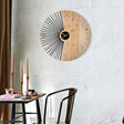 Orologio rotondo da parete in metallo e legno dal design semplice che richiama i raggi del sole. Funzionamento con batteria AA non inclusa.