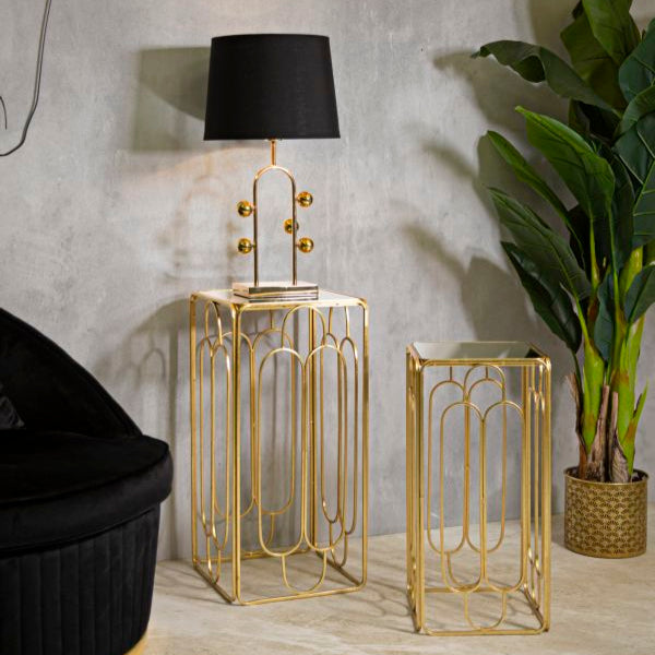 P/TELEFONO ARTY COPPIA QUADRATO - Elegante coppia di tavolinetti quadrati in metallo dorato con piano in vetro a specchio dalle linee geometriche e arrotondate. Il particolare design unito alla morbidezza delle linee rendono speciale ogni ambiente.