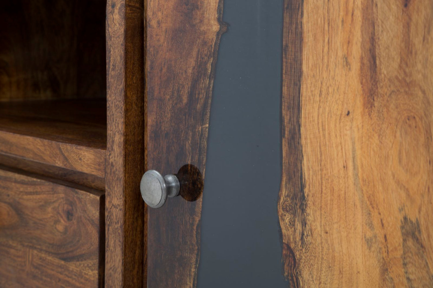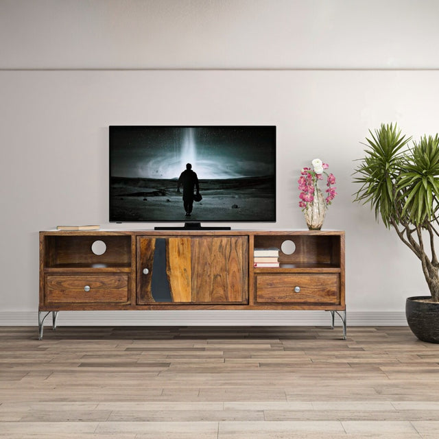 P/TV MUSTANG - Elegante mobile porta tv in legno massello di acacia composta da 2 ripiani, 2 ante e 2 cassetti. La particolare lavorazione con resina incastonata sulle ante dona un tocco di colore e modernità ad un pezzo estremamente elegante e classico.