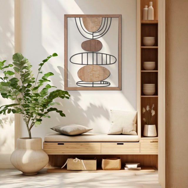 Pannello decorativo 3D da parete in metallo e legno composto da figure astratte. I toni caldi si accostano perfettamente ad ogni tipologia di arredo.