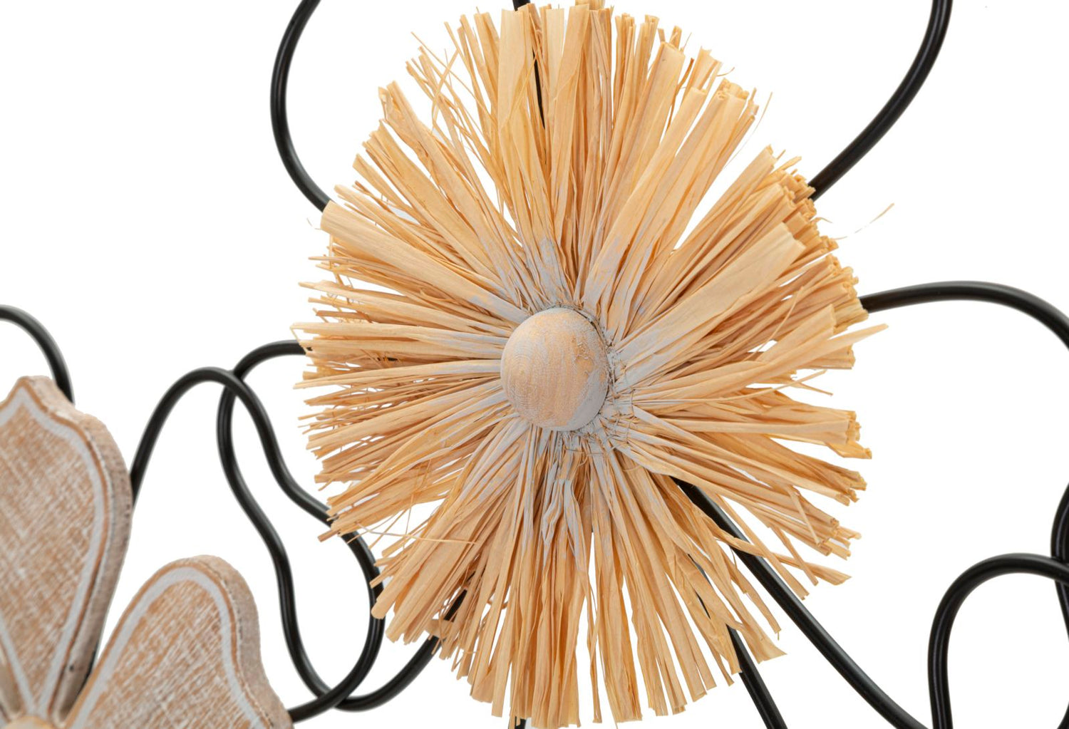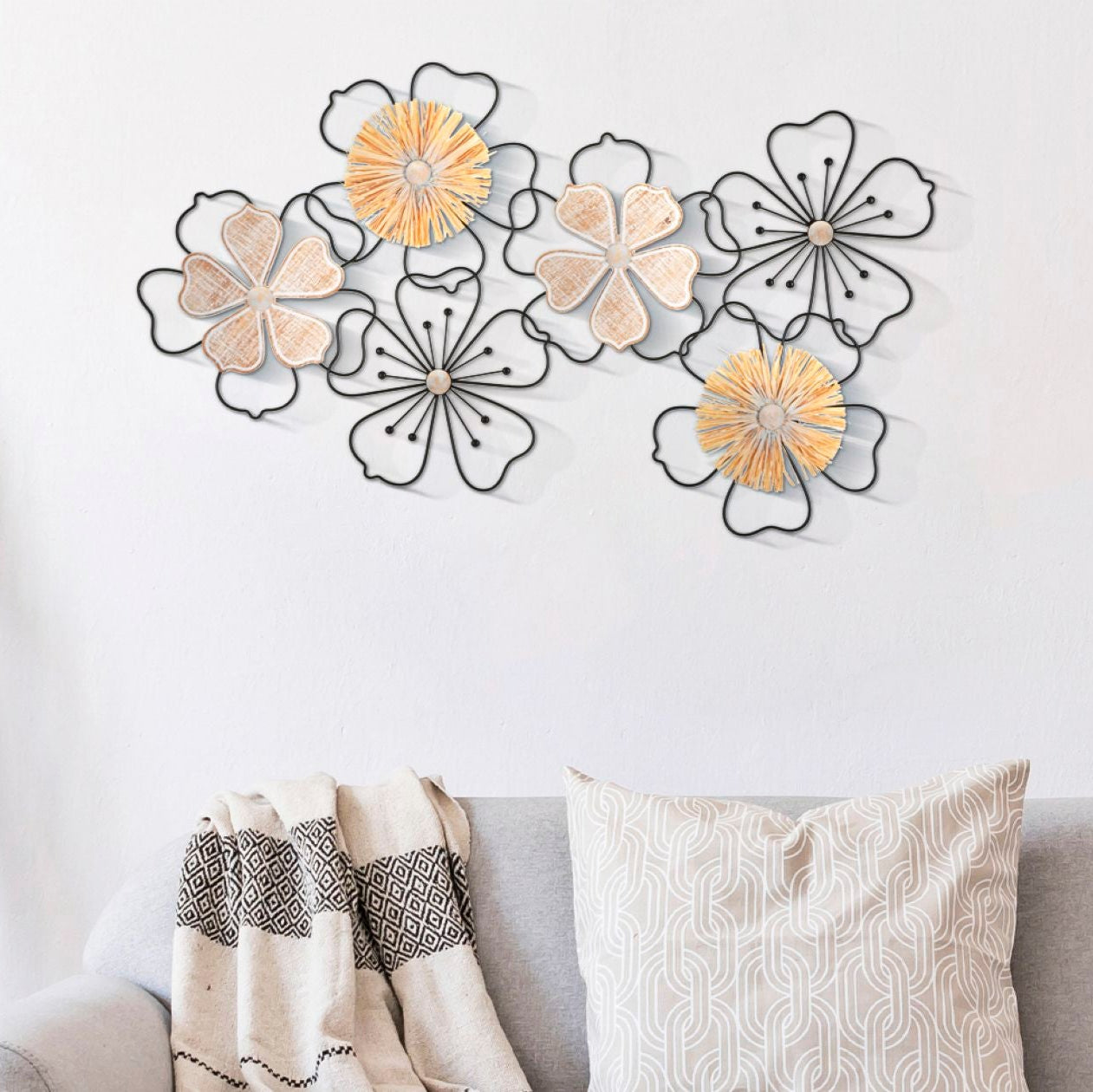 Pannello decorativo 3D da parete in metallo e legno composto da fiori.