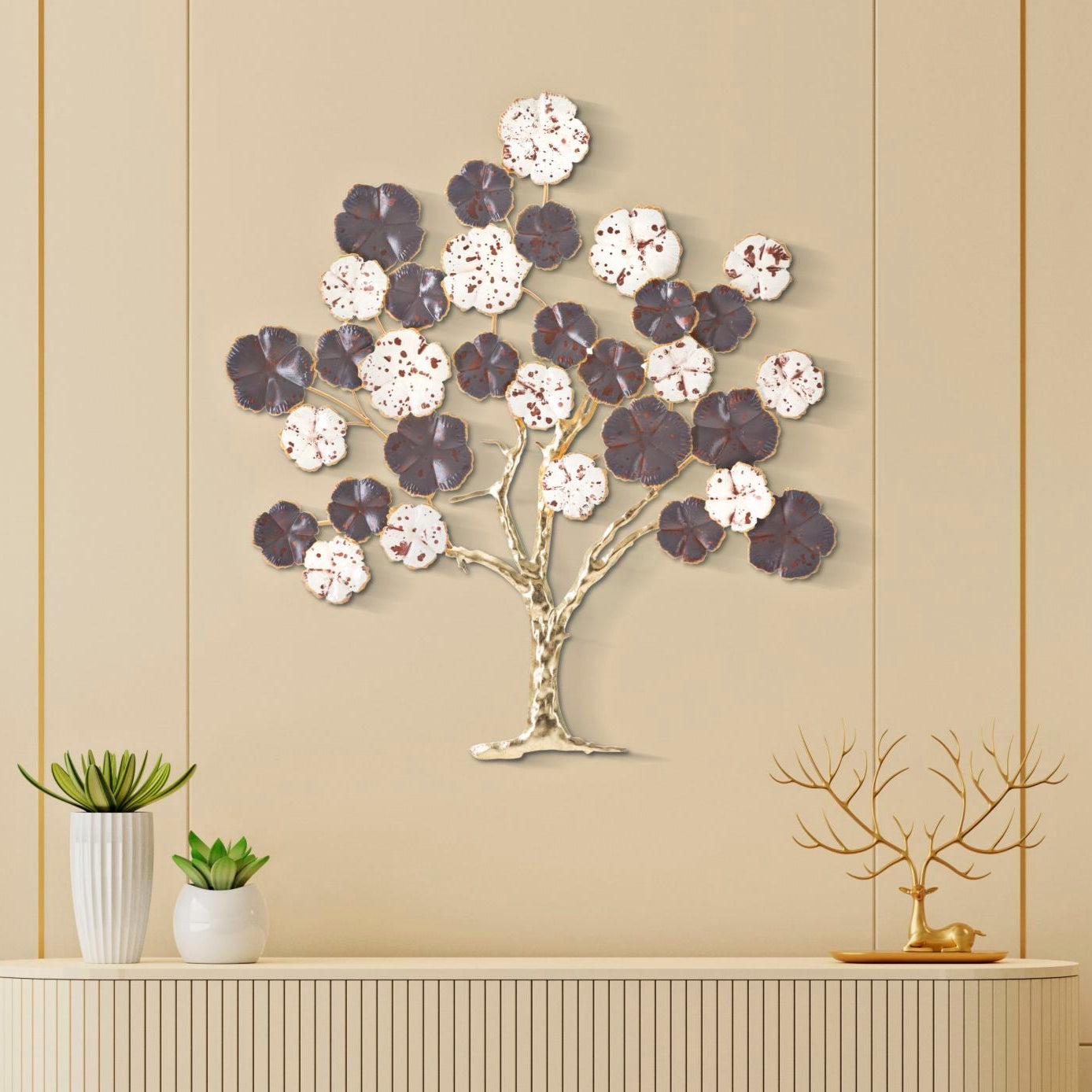 PANNELLO IN FERRO ALBERO PURPY - Pannello decorativo 3D da parete a forma di albero in fiore dai colori soffusi e impreziosito dal tronco dorato.