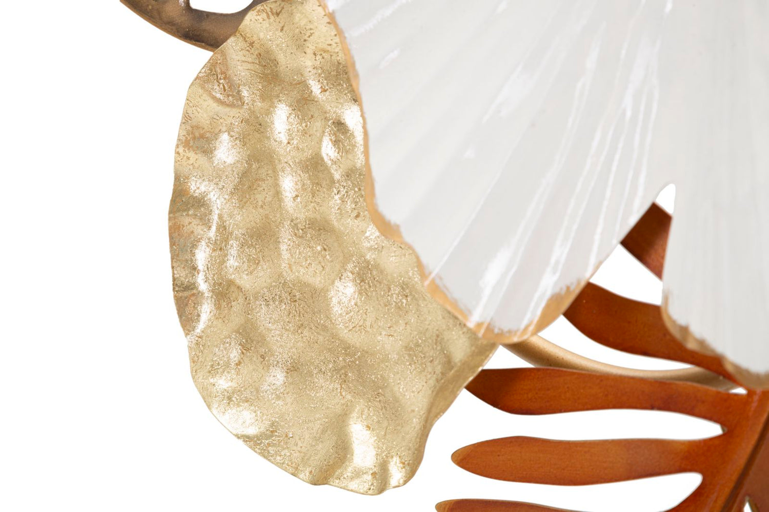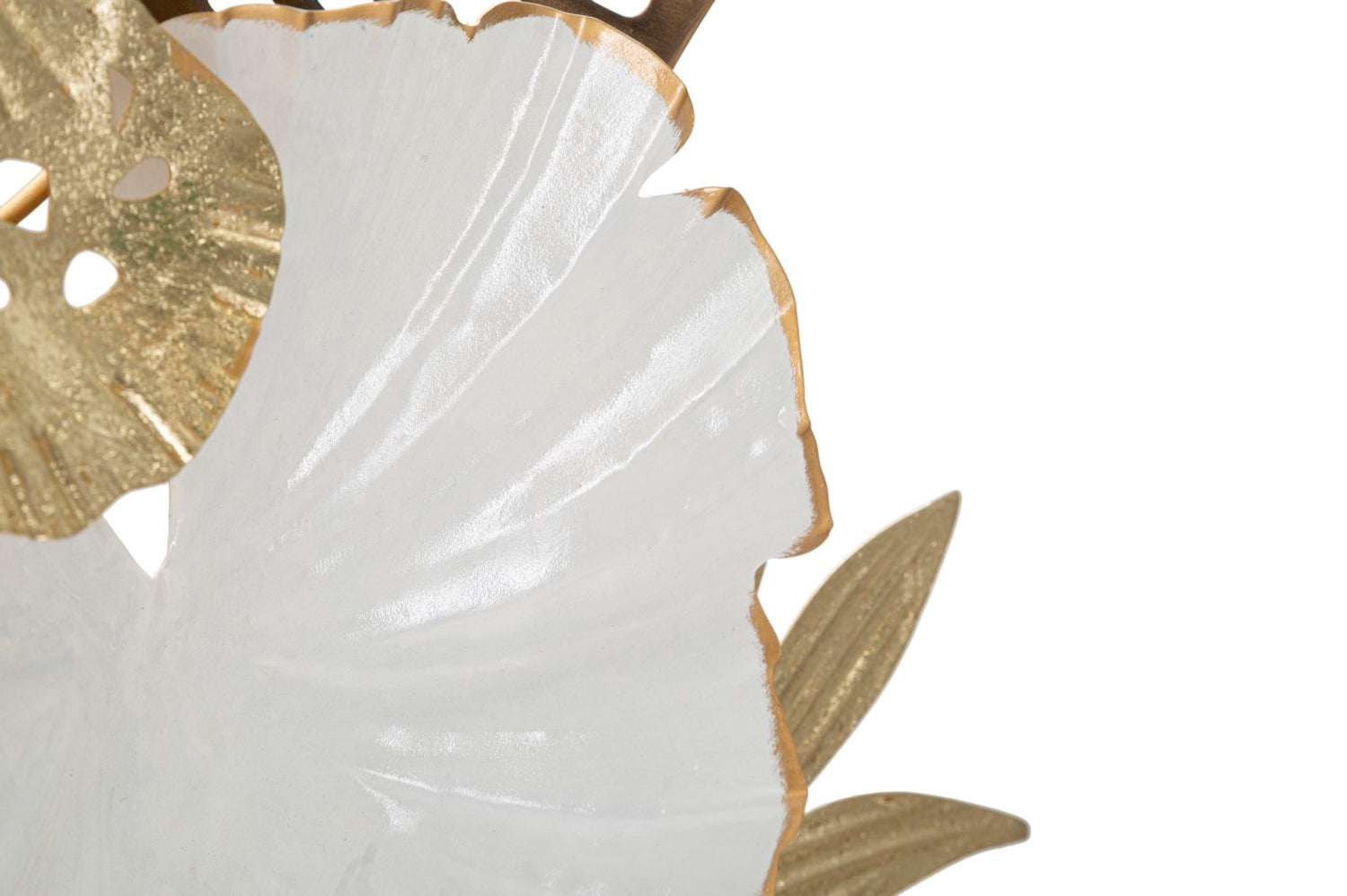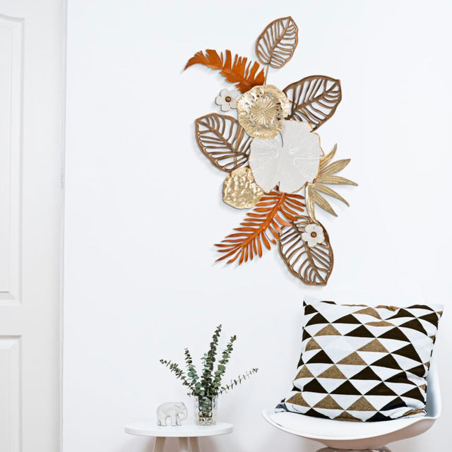 Un pannello decorativo dal design tropicale che unisce l’eleganza delle foglie traforate in metallo con dettagli floreali bianchi e dorati. I toni caldi ruggine e oro si mescolano al bianco lucido creando un contrasto vivace e raffinato, perfetto per illuminare ogni ambiente.