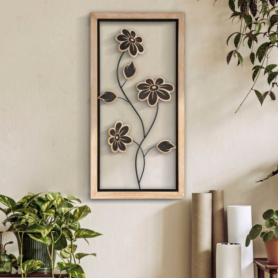 Pannello decorativo 3D da parete in metallo e legno composto da eleganti fiori racchiusi in una cornice rettangolare in legno.