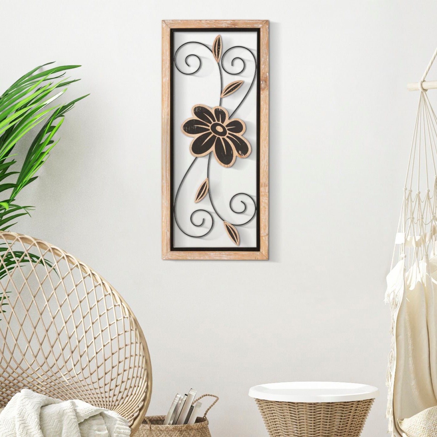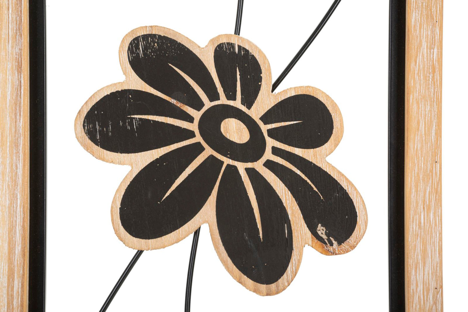 Un complemento d’arredo che unisce materiali naturali e design moderno. La cornice in legno naturale racchiude un elegante motivo floreale in metallo, con finitura nera e dettagli dorati che donano contrasto e raffinatezza.