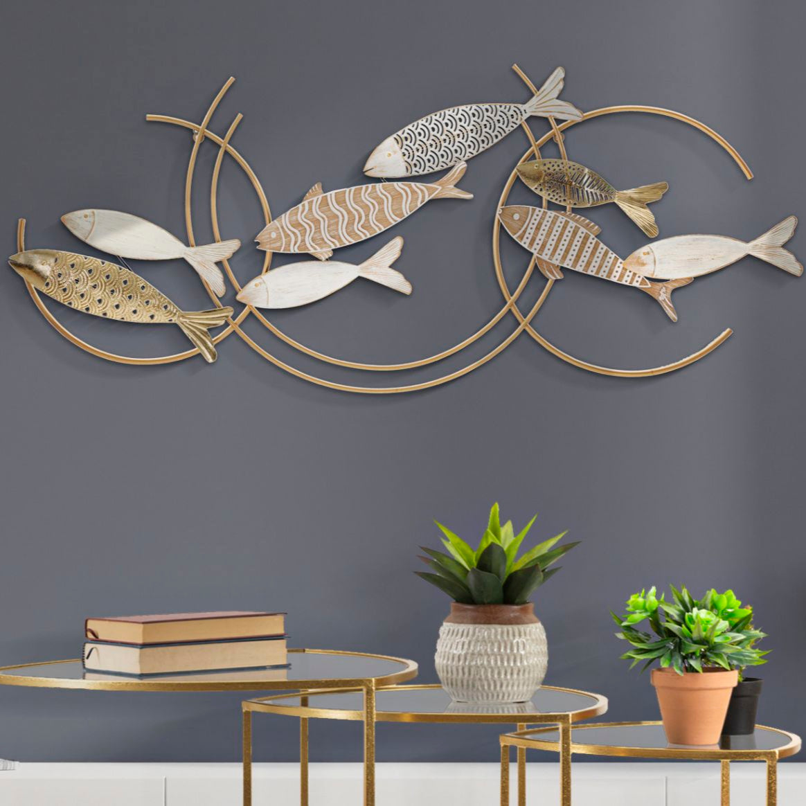 PANNELLO IN FERRO FISHY MOVE - Pannello decorativo 3D da parete in metallo e MDF composto da un insieme di pesci racchiusi in forme circolari