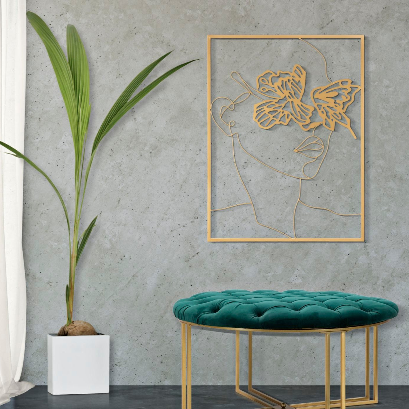 Pannello decorativo 3D da parete dai tratti semplici ed essenziali che vanno a comporre un volto con delle farfalle, il tutto racchiuso in una cornice rettangolare.
