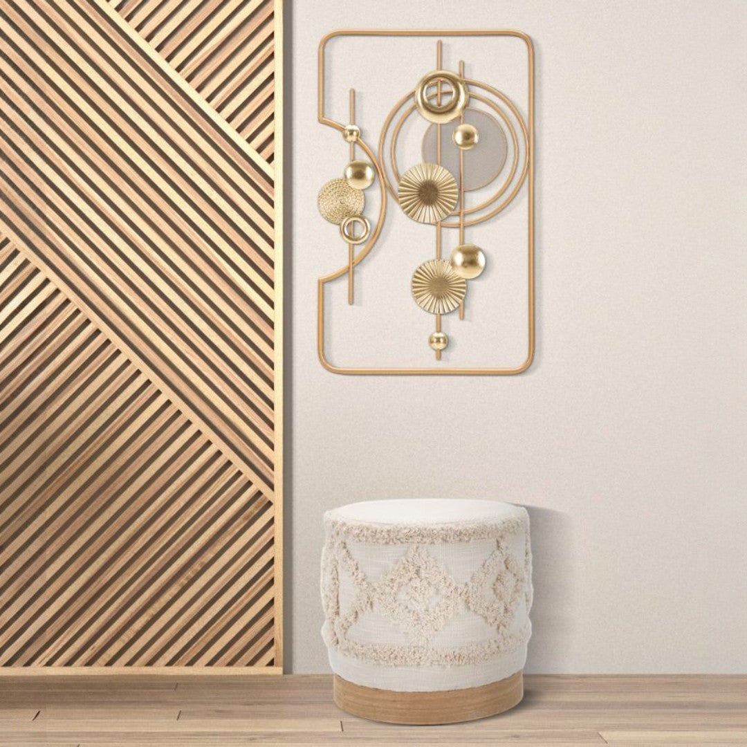 Un’opera d’arte murale che unisce forme circolari e linee geometriche in un gioco di volumi e riflessi dorati. La finitura oro conferisce un tocco di lusso e contemporaneità, perfetta per ambienti moderni e ricercati.