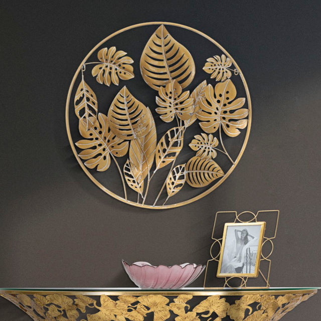 PANNELLO IN FERRO JUNGLE ROUND - Pannello decorativo 3D in metallo dorato composto da un insieme di foglie racchiuse in una struttura circolare. La lucentezza dell'oro dona un tocco di fascino ad ogni ambiente.