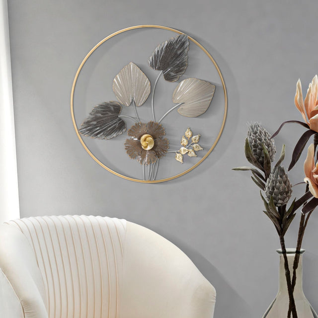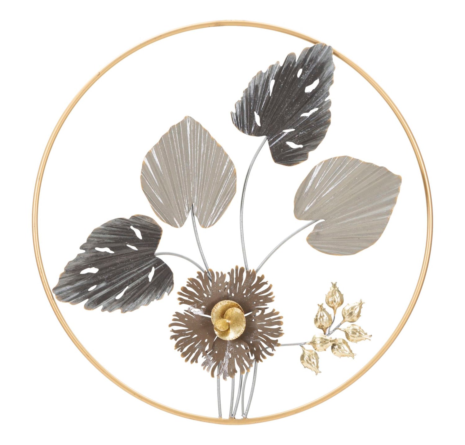 PANNELLO IN FERRO ROD - Pannello decorativo 3D con foglie e fiori racchiusi in una struttura circolare. I colori pastello e l'oro creano un delicato contrasto che dona classe ad ogni parete.