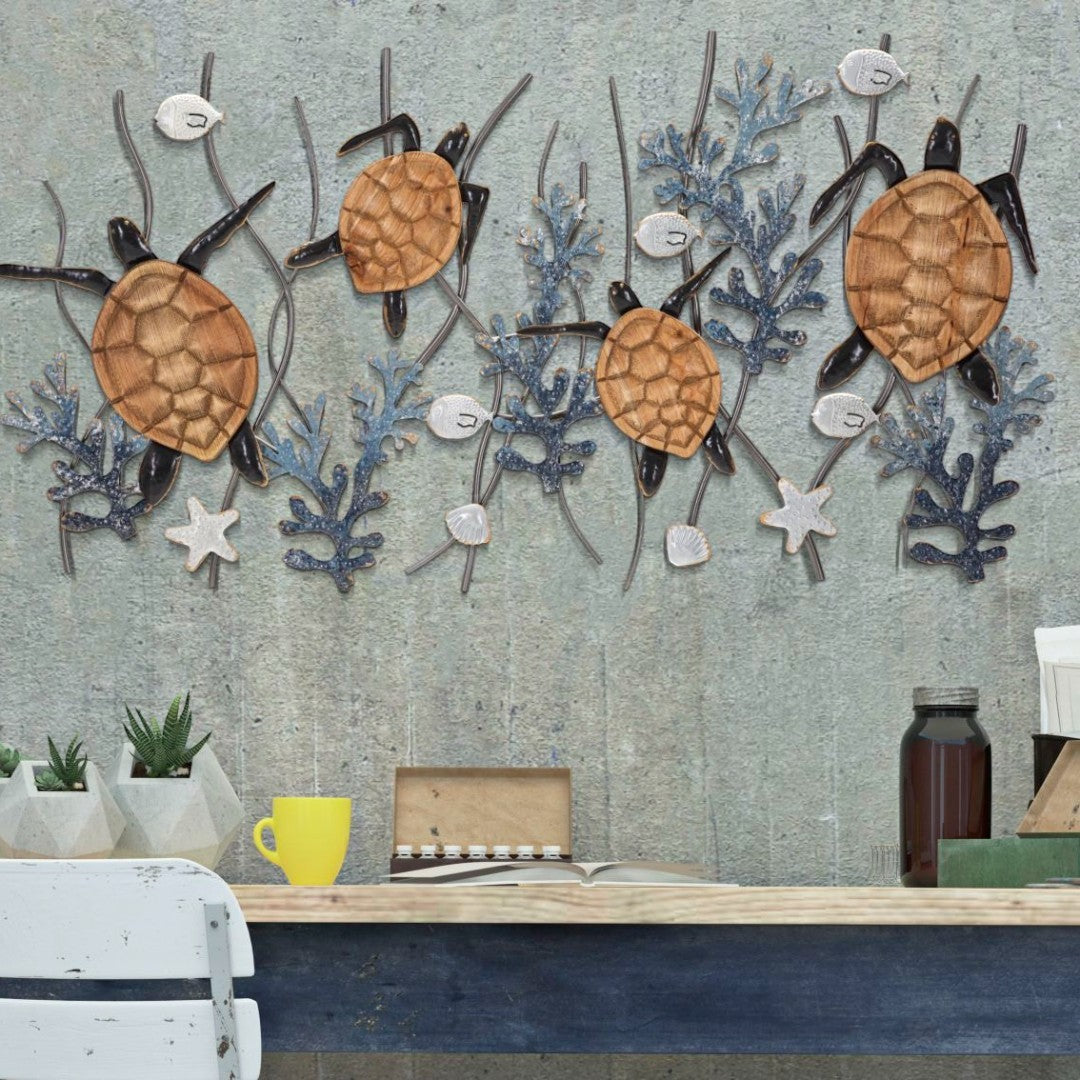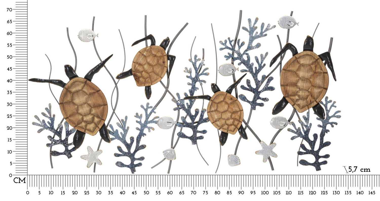 Un’opera d’arte murale che cattura la bellezza del mondo sottomarino: tartarughe, coralli e piccoli pesci prendono vita in una composizione armoniosa e luminosa. Realizzato in metallo con dettagli curati, dona movimento e freschezza alla parete.