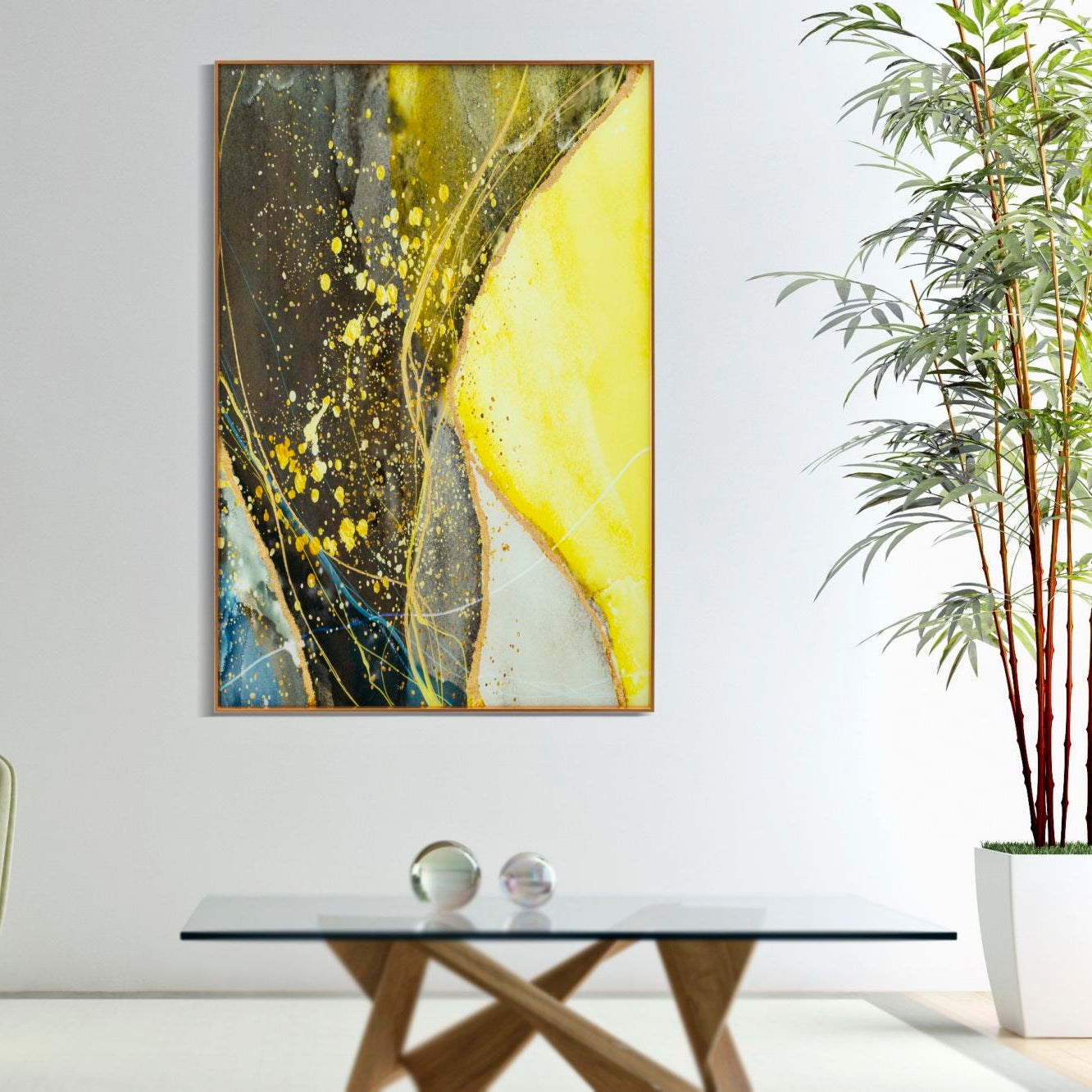 PANNELLO VETRO C/CORNICE SUNNY - Pannello decorativo in vetro con eleganti decorazioni astratte. Il pannello è racchiuso in una semplice cornice di metallo dorato.