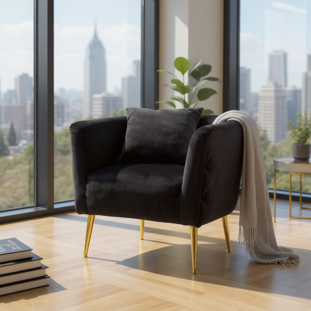 POLTRONA BUCAREST NERO - Poltrona in velluto e metallo dorato. Maestose sedute che si ispirano ai camerini delle grandi dive di Hollywood. Il metallo dorato e il velluto si fondono in uno stile unico. Ideali da collocare in camera da letto o in salotto per sentirsi delle star.