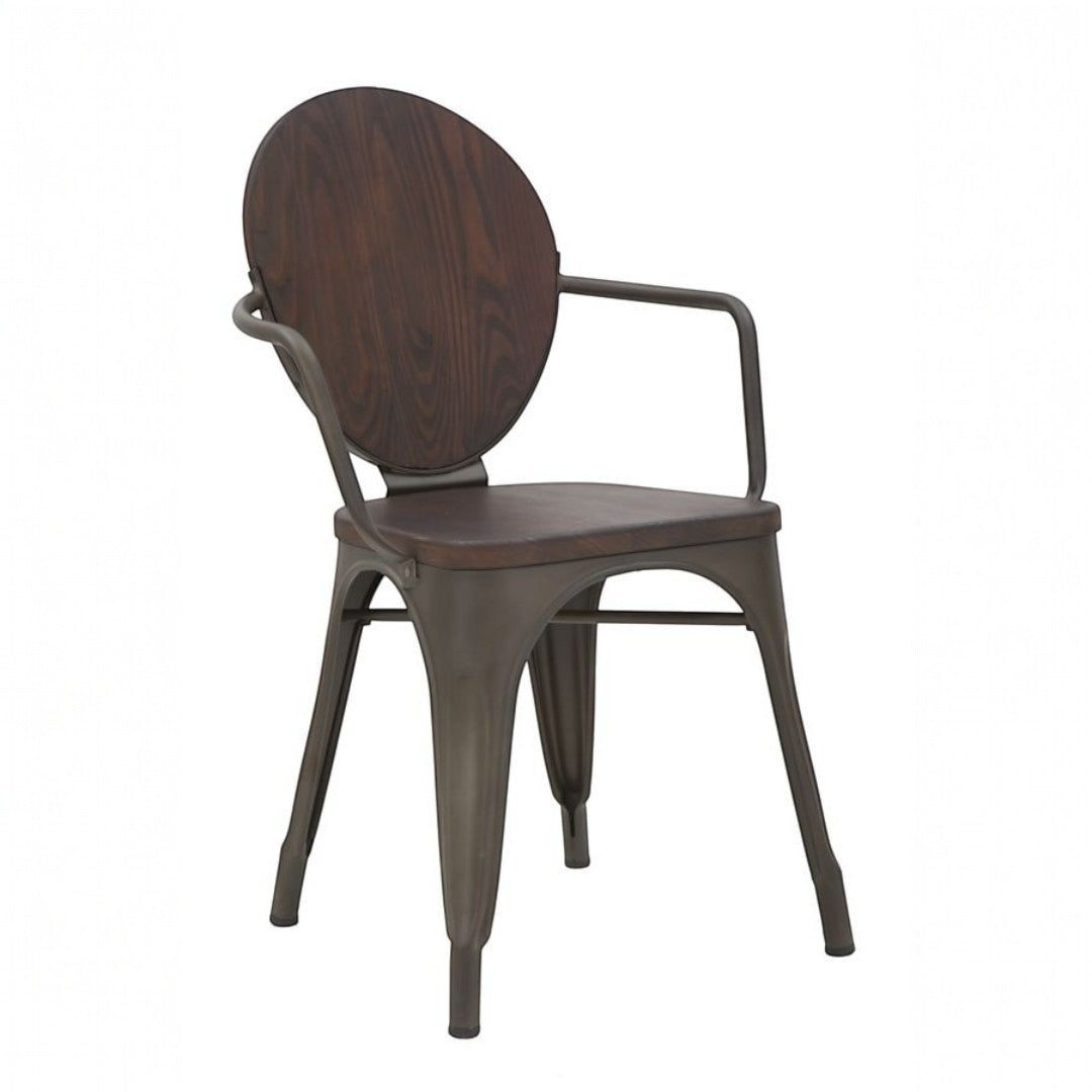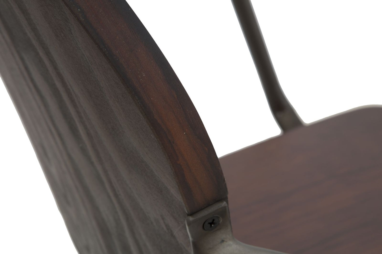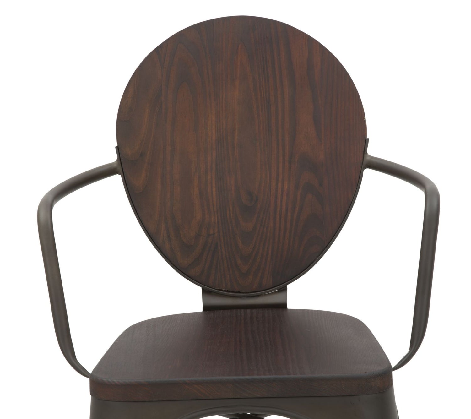 Una seduta robusta ed elegante che unisce la solidità della struttura in metallo al calore del legno. Lo schienale rotondo e la seduta in legno scuro offrono comfort e stile, mentre i braccioli rendono la sedia ancora più accogliente.