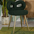Sedia Mini Ilary verde, elegante e di carattere, con morbido rivestimento bouclé e gambe dorate. Ideale per arricchire spazi moderni e raffinati.