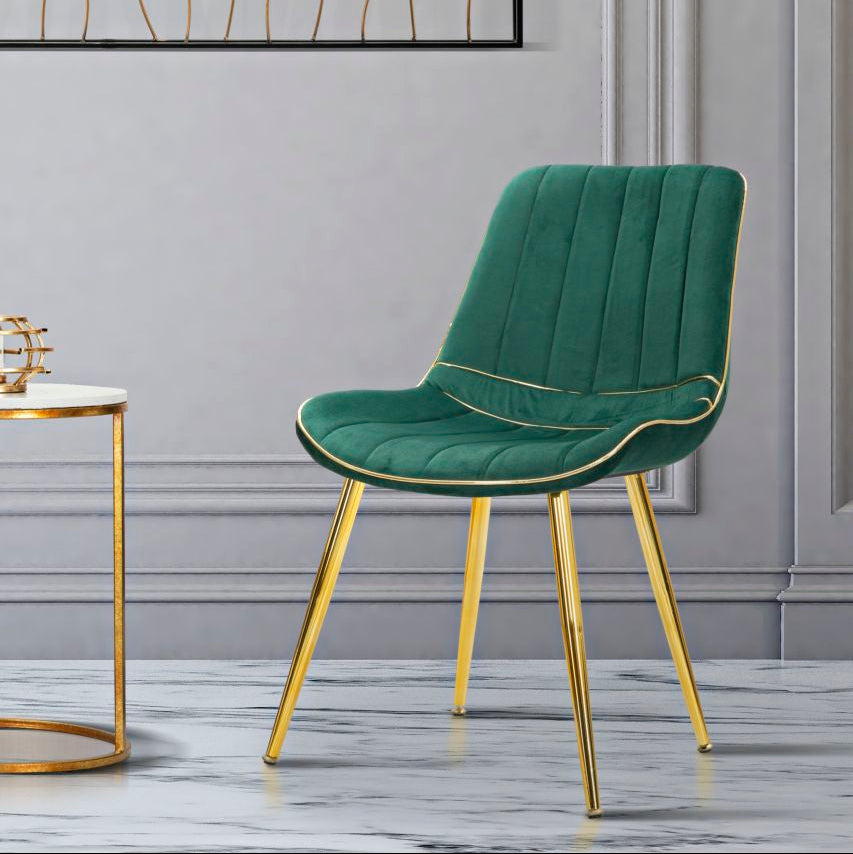 SEDIA PARIS VERDE/GOLD SET 2 PZ - Set di 2 sedie in tessuto verde imbottito con rifiniture dorate e gambe in metallo dorato. L'eleganza del tessuto e dell'oro unite per offrire un comodo relax.