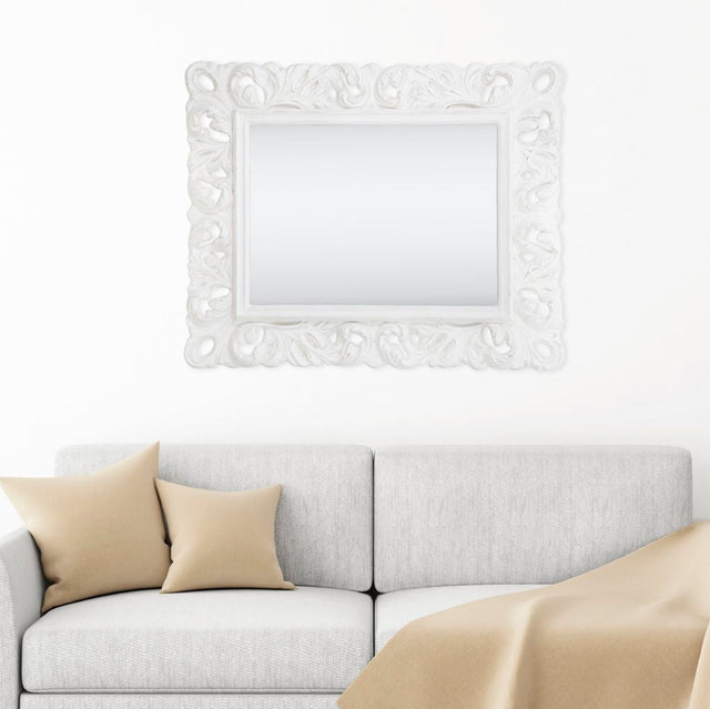 Questo specchio rettangolare presenta una cornice intagliata in stile barocco, rifinita con una delicata verniciatura bianca effetto anticato. Ideale per camere da letto, ingressi o salotti romantici, dona luce e charme a ogni ambiente.