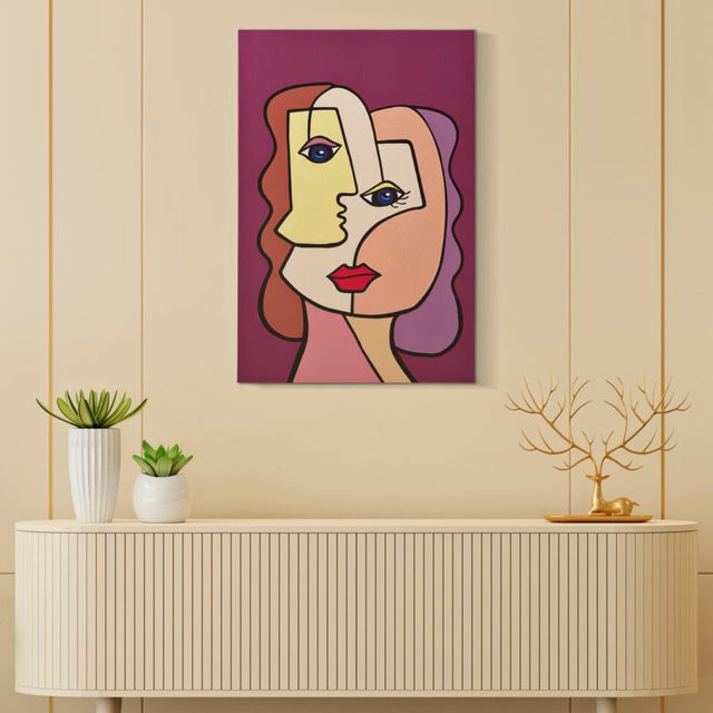 STAMPA DIPINTA FACES NEW -B- Stampa dipinta su tela con telaio in legno dal design che rimanda al cubismo e dai colori accesi.