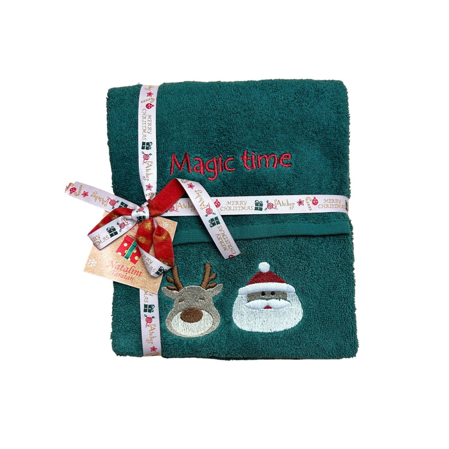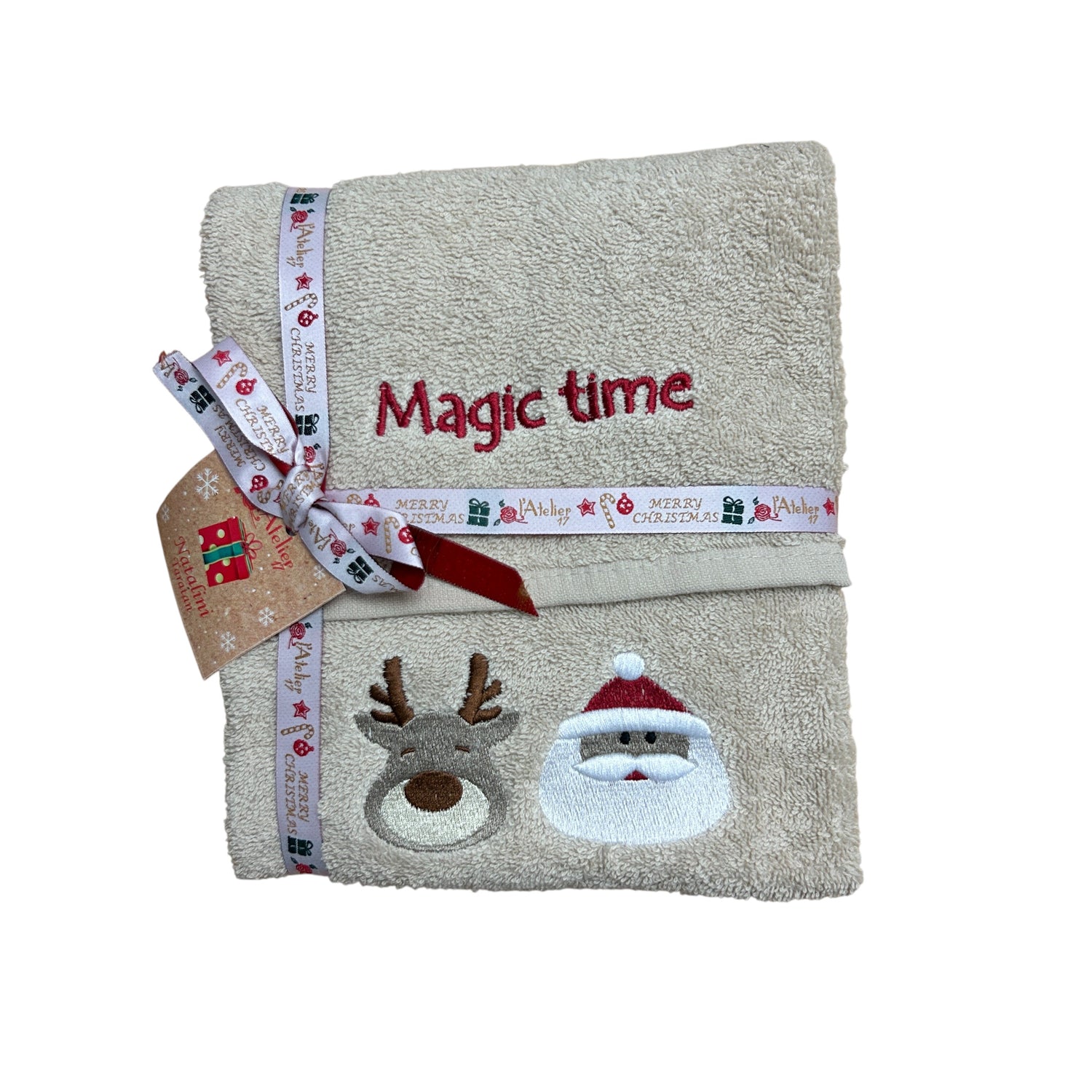 Il ricamo natalizio con la scritta “Magic time”, la renna e Babbo Natale aggiunge un tocco caldo e festoso, perfetto per decorare la casa nel periodo più magico dell’anno o per accogliere gli ospiti con un dettaglio a tema. È anche una raffinata idea regalo già pronta grazie al fiocco decorativo.