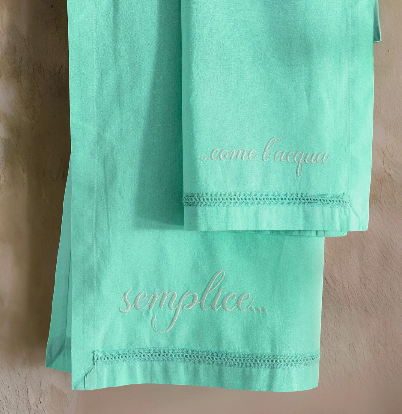 La texture del tessuto è piacevole al tatto e assicura una buona capacità assorbente, ideale per l’uso quotidiano senza rinunciare allo stile. Le scritte ricamate aggiungono un dettaglio distintivo che rende il set perfetto anche come idea regalo.