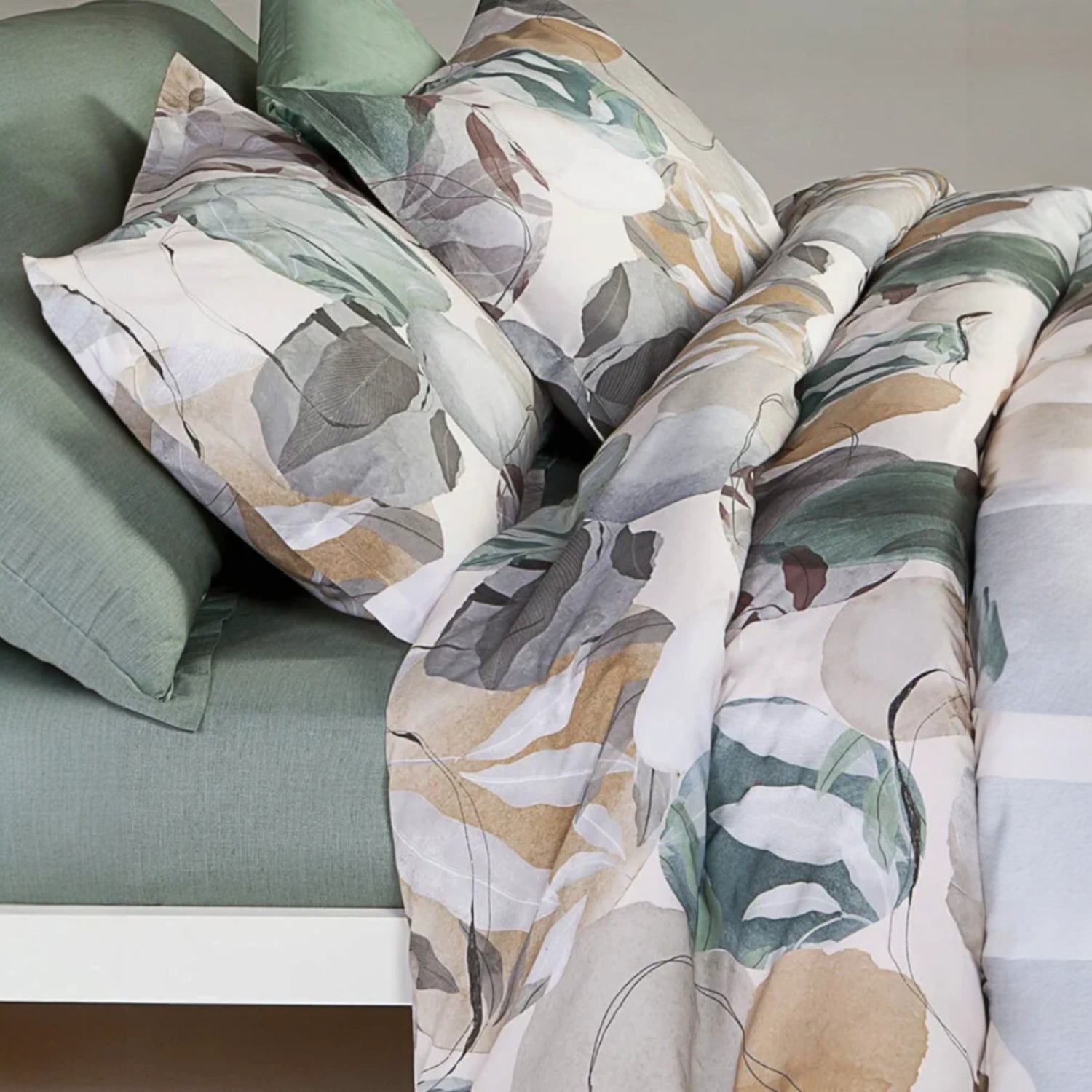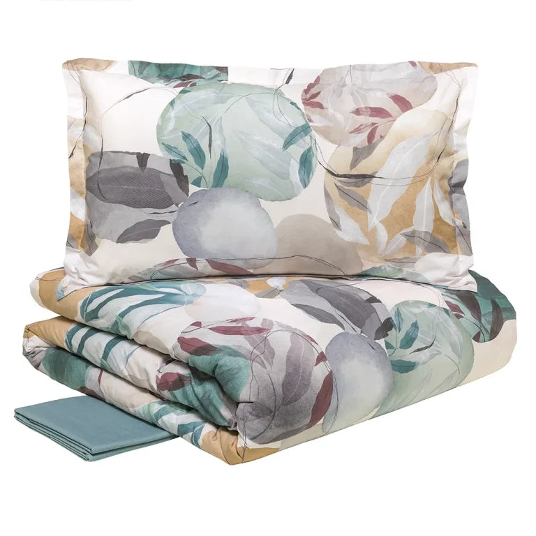 Completo copripiumino realizzato in percalle di cotone 200 T.C. RICICLATO. La sacca e le federe a 4 volant sono stampati in digitale con motivi floreale; il sotto con angoli è stampato in tinta unita con un delicato motivo che ricorda la trama del lino. Vesti la tua camera da letto con la nuova collezione sostenibile di Tessitura Randi.