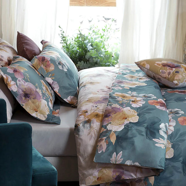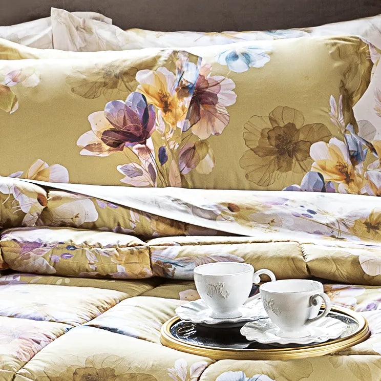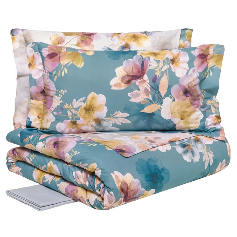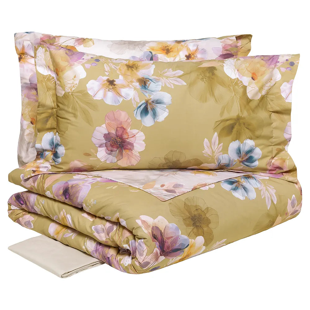 Completo copripiumino double face realizzato in percalle di cotone 200 T.C. La sacca e le federe a 3 volant sono stampati in digitale con motivi floreali, il sotto con angoli è in tinta unita. Vesti la tua camera da letto con lo stile e la qualità inconfondibile di Tessitura Randi.