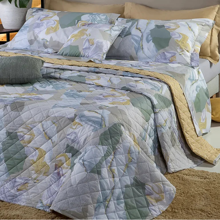 Completo copripiumino realizzato in percalle di cotone 200 T.C. La sacca e le federe a 3 volant sono stampati in digitale con motivi floreali, il sotto con angoli è in tinta unita. Vesti la tua camera da letto con lo stile e la qualità inconfondibile di Tessitura Randi.