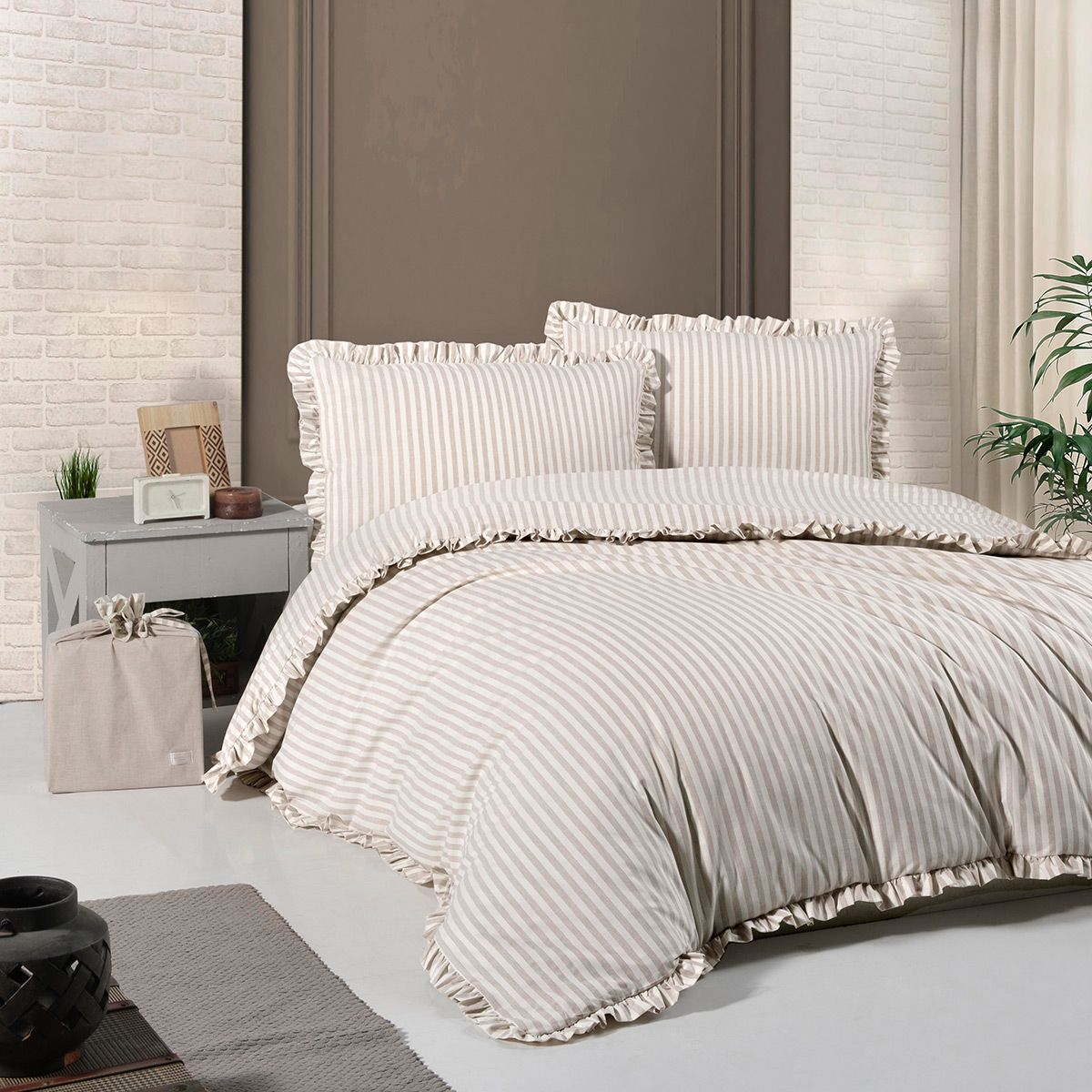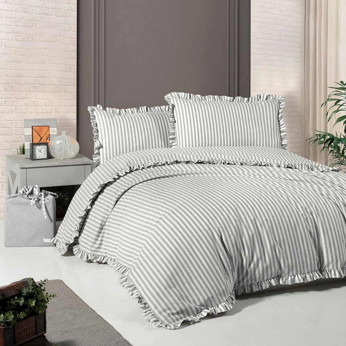 - Singola: Sacco copripiumino 155 x 205 + 1 Federa 47 x 80 cm con volant + 1 Sacchetto Portabiancheria;