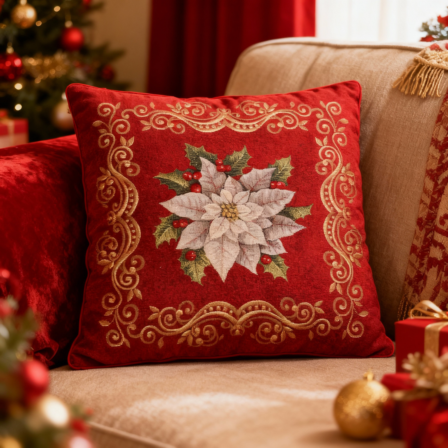 Decora la tua casa con il cuscino natalizio Karì, realizzato in pregiato tessuto Gobelin con filato Lurex che dona un tocco luminoso e festivo. Sfoderabile con zip, è completo di imbottitura in morbida fibra anallergica per il massimo comfort.
