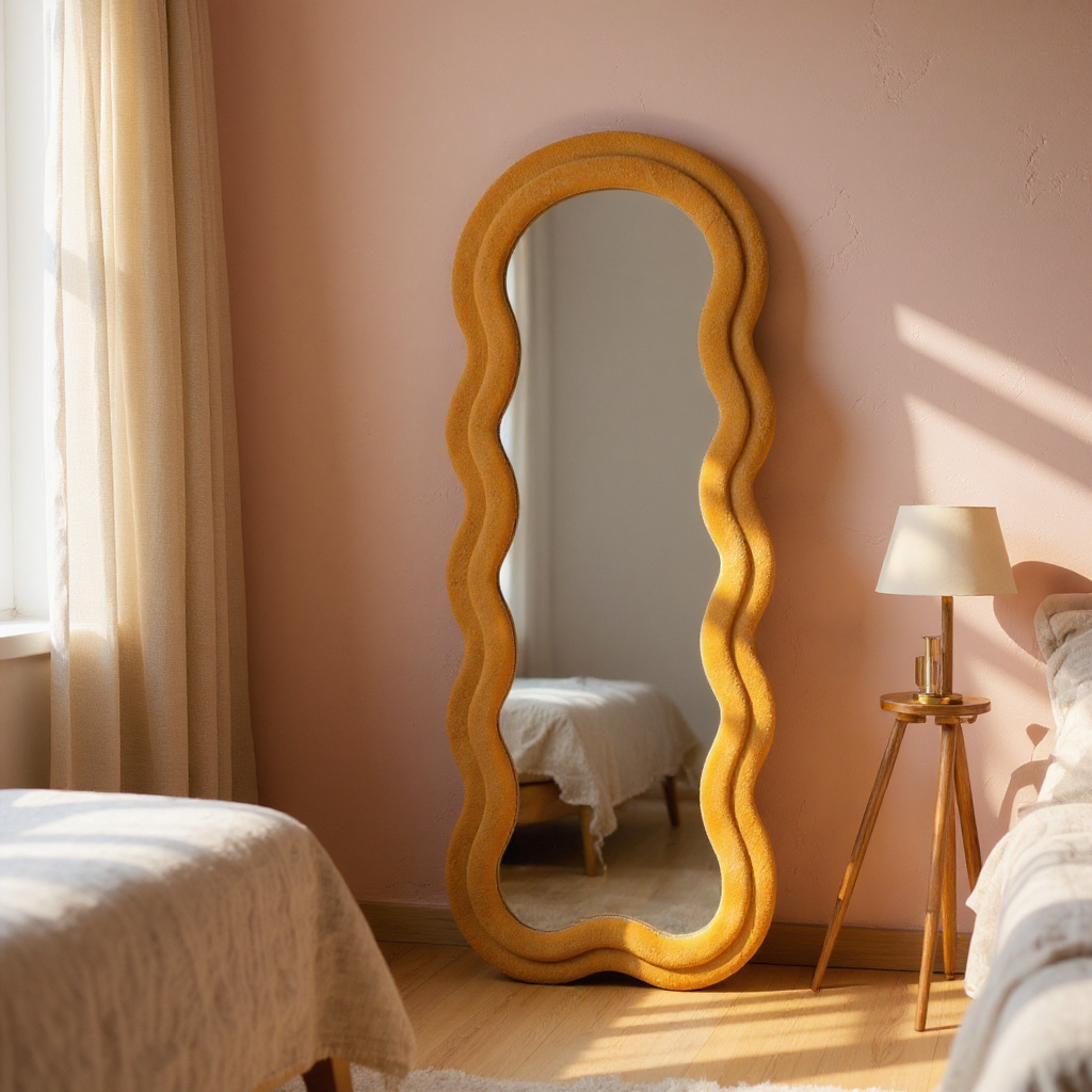 SPECCHIO DA MURO TEDDY SENAPE - Specchio da parete senape con cornice in legno rivestita in tessuto bouclè dalle forme morbide e sinuose.