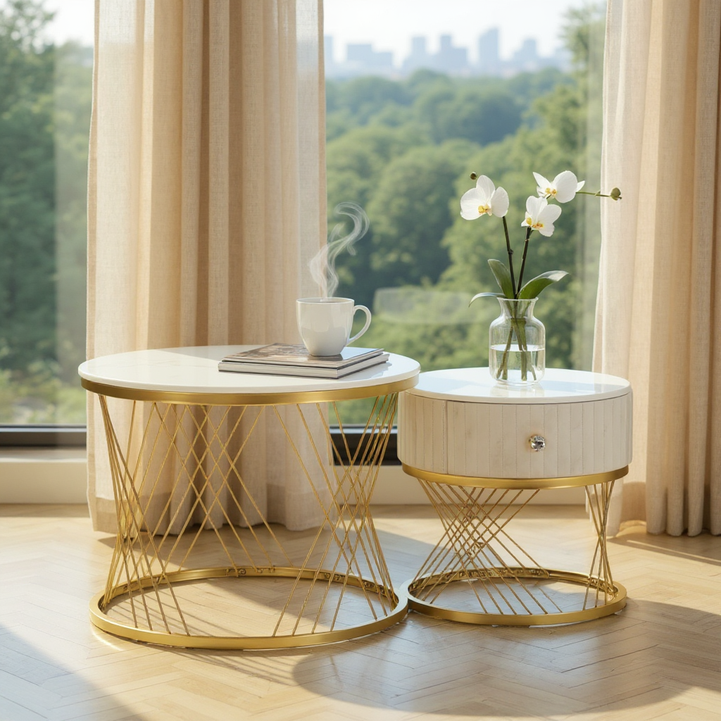 Tavoli da caffè Votix, coppia elegante con intreccio dorato e piani coordinati, ideali per dare un tocco glamour e originale a ogni spazio living.