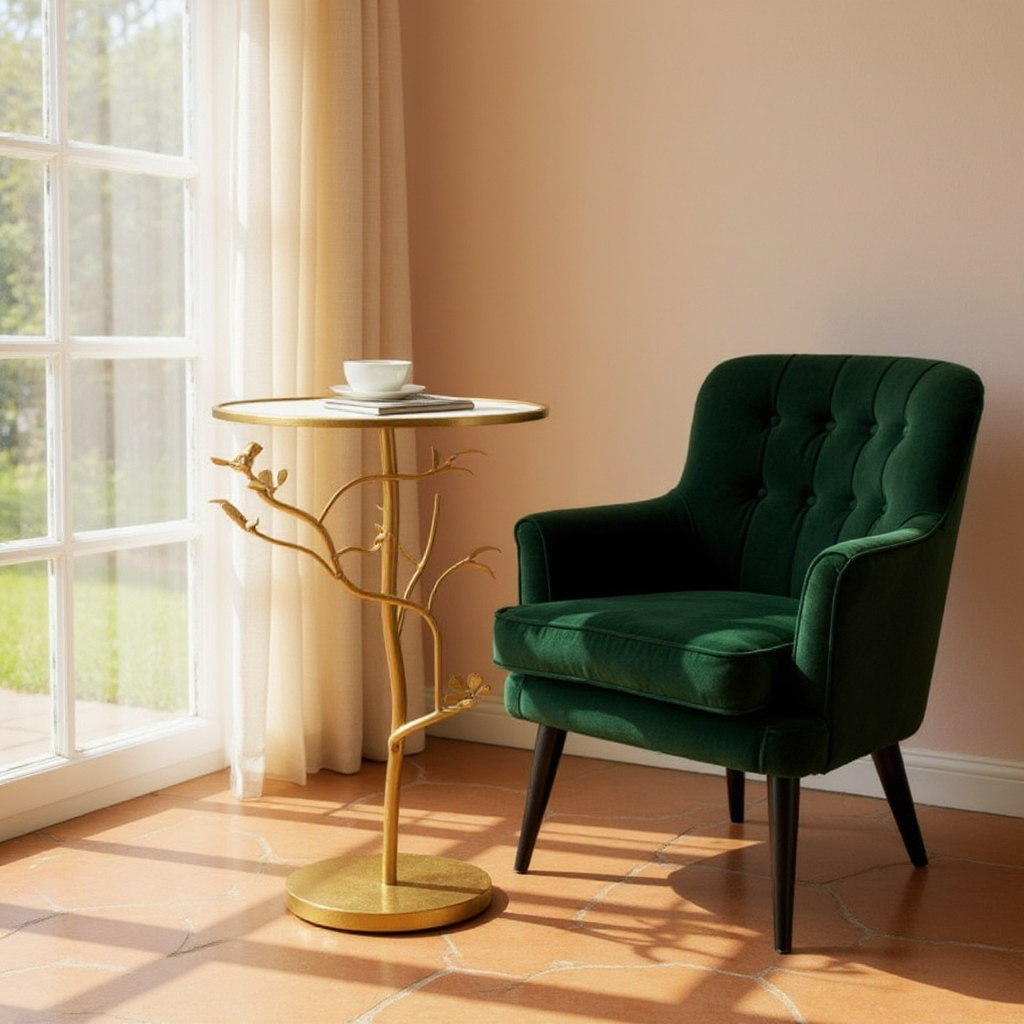 TAVOLINETTO BIRDS GLASS - Tavolinetto Birds Glass, struttura dorata con rami intrecciati e piano in vetro. Ideale per dare leggerezza e charme ad ambienti sofisticati.
