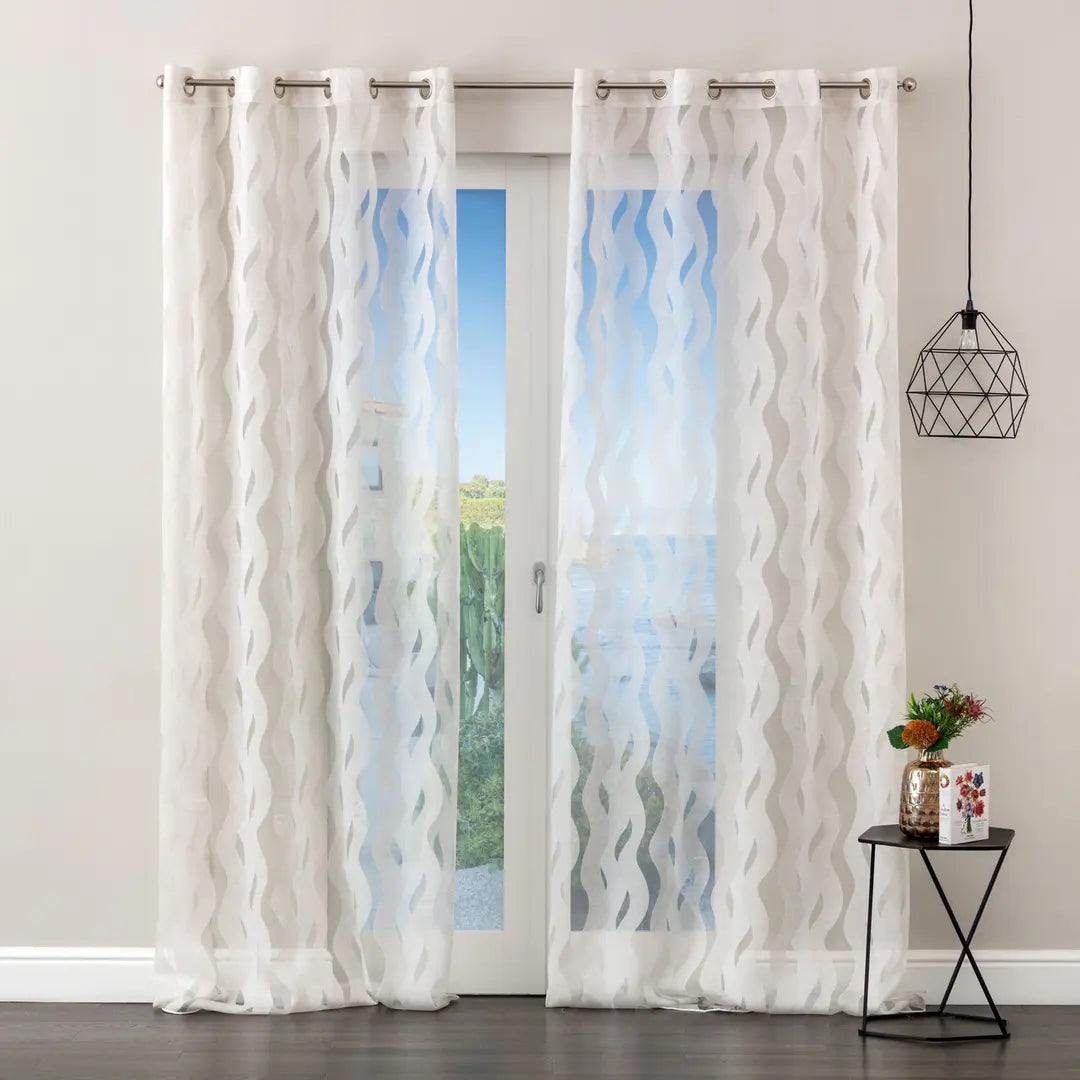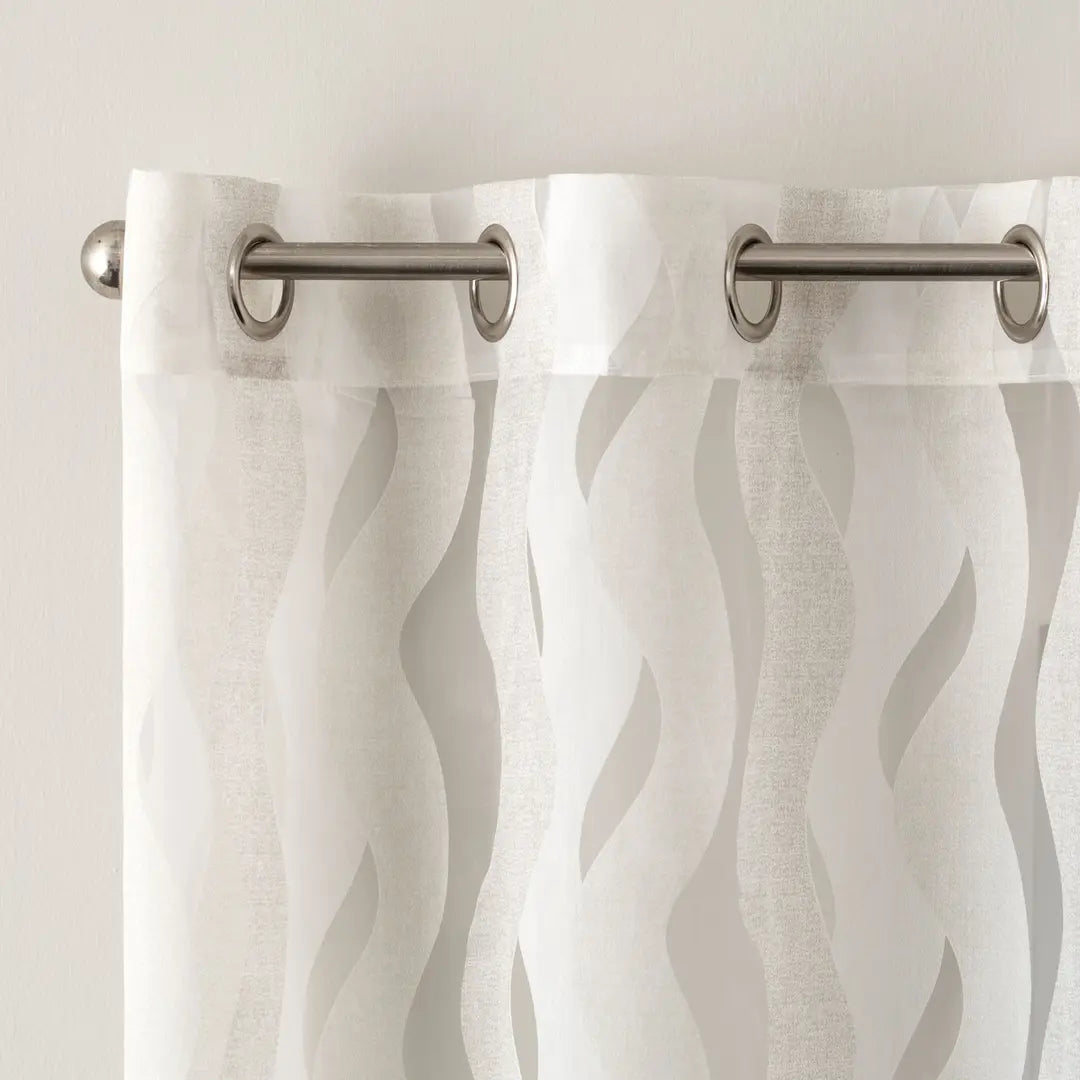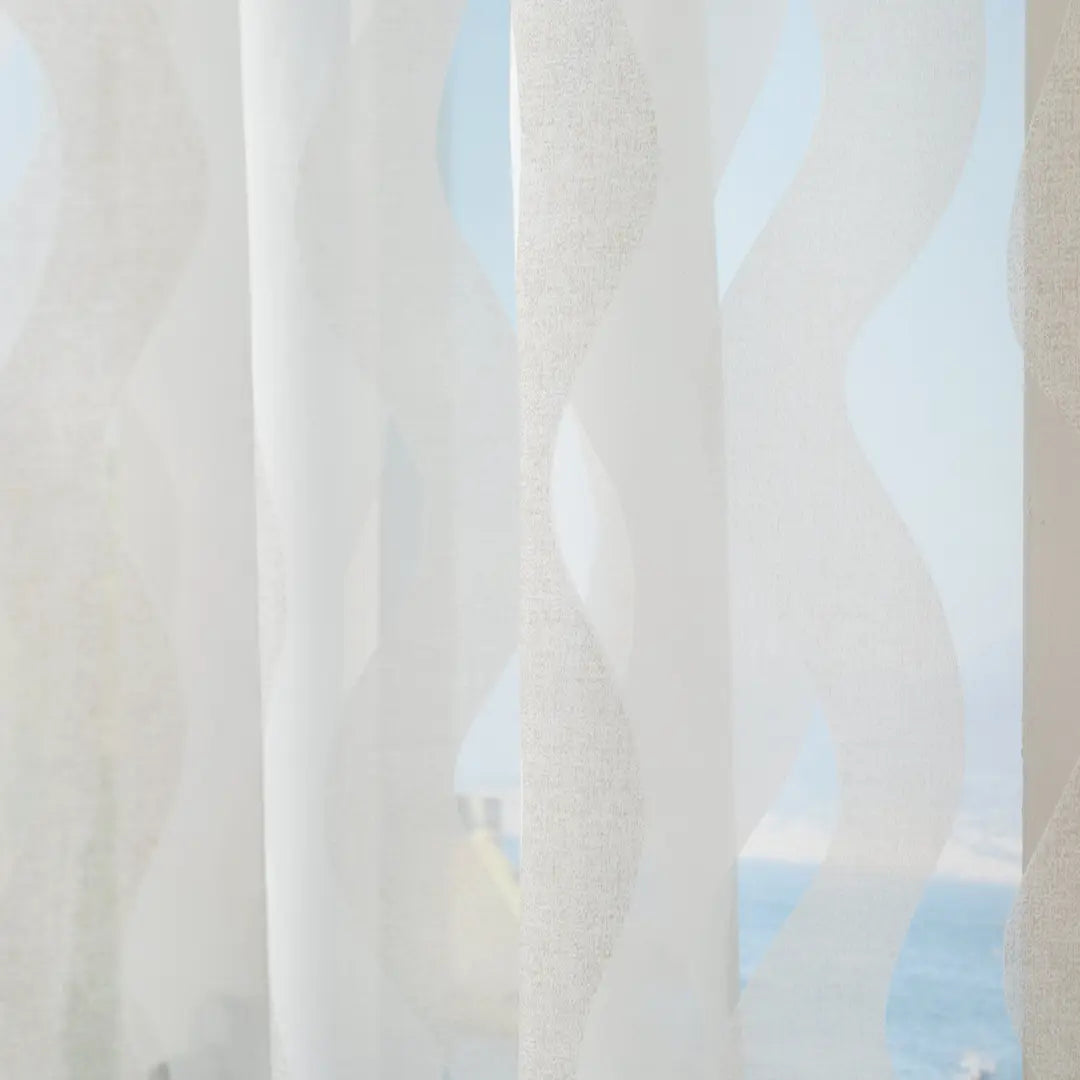 Tenda confezionata con borchie, tessuto semitrasparente. Finitura con piombo.