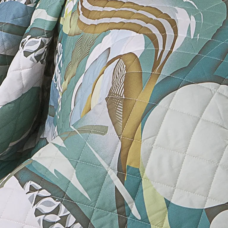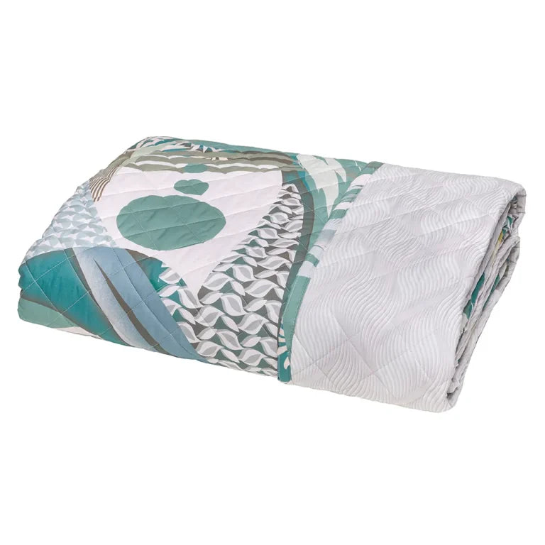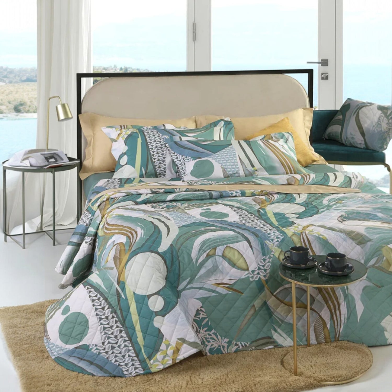 Trapunta leggera realizzata in percalle di cotone 200 T.C. Capo stampato in digitale con motivi geometrici, esaltati dalla trapuntatura a rombi.