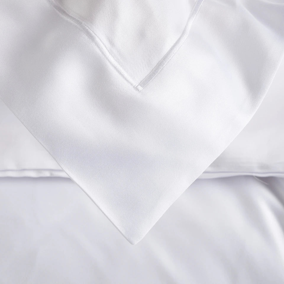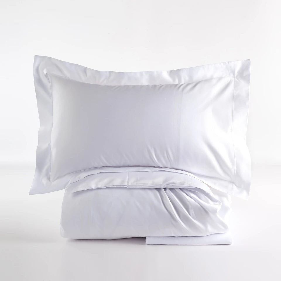 Il set comprende un sacco copripiumino 250x210 cm con pattella da 40 cm, un lenzuolo sotto con angoli 180x200 cm e due federe 50x80 cm, tutti realizzati in 100% raso di cotone Made in Italy.