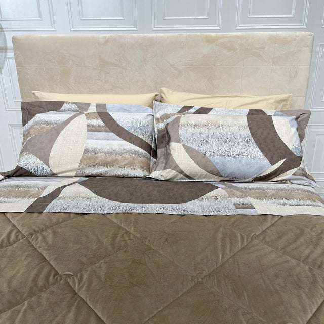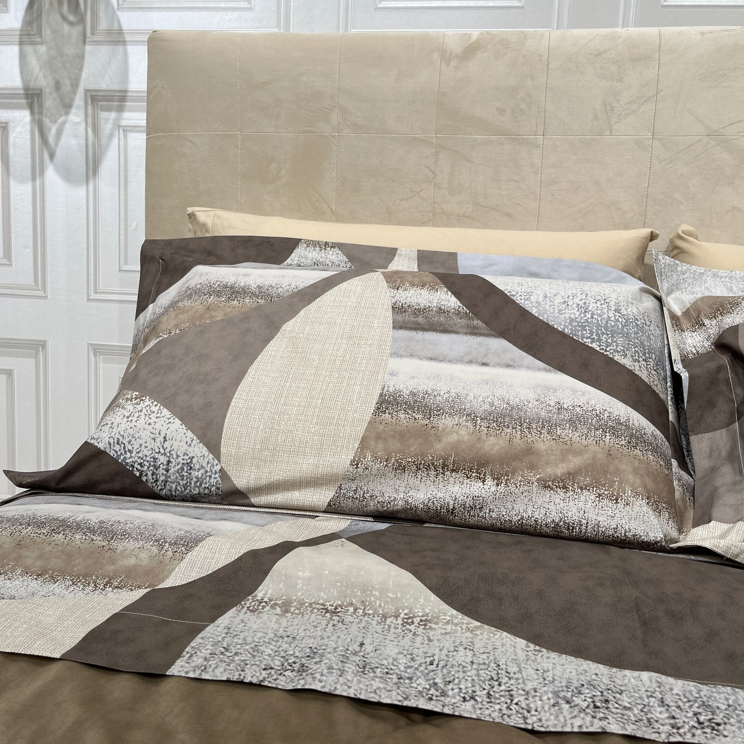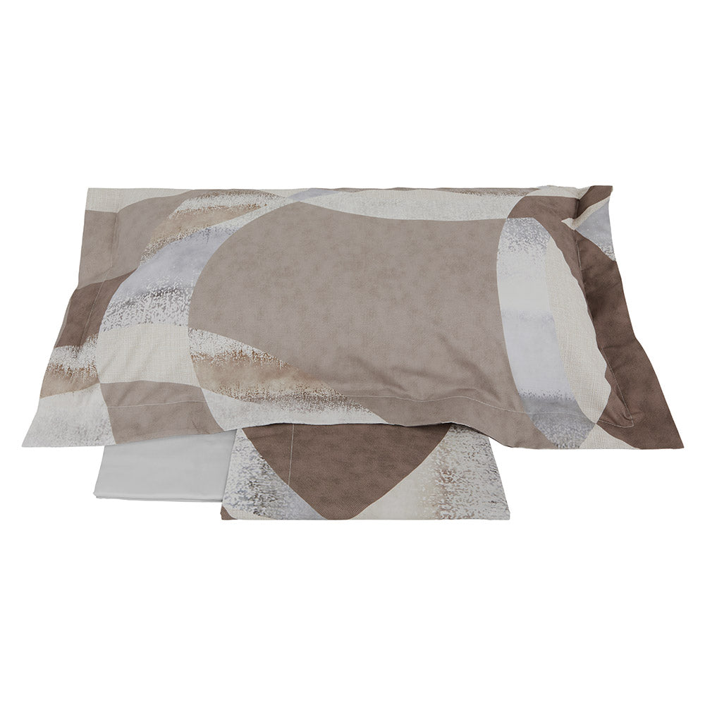 Lenzuolo sopra e federe a 3 volant stampati in digitale con motivi geometrici; lenzuolo sotto con angoli in tinta unita.