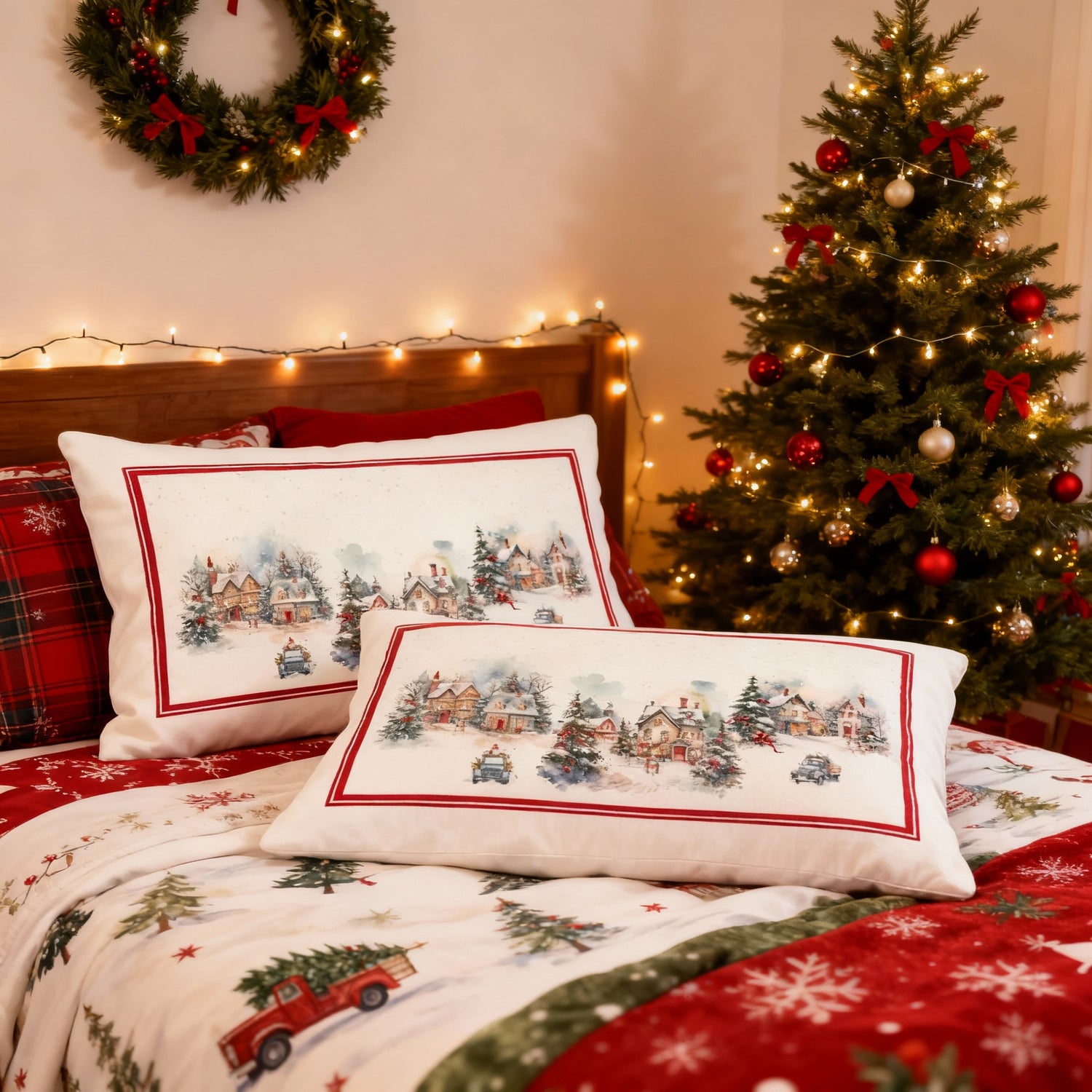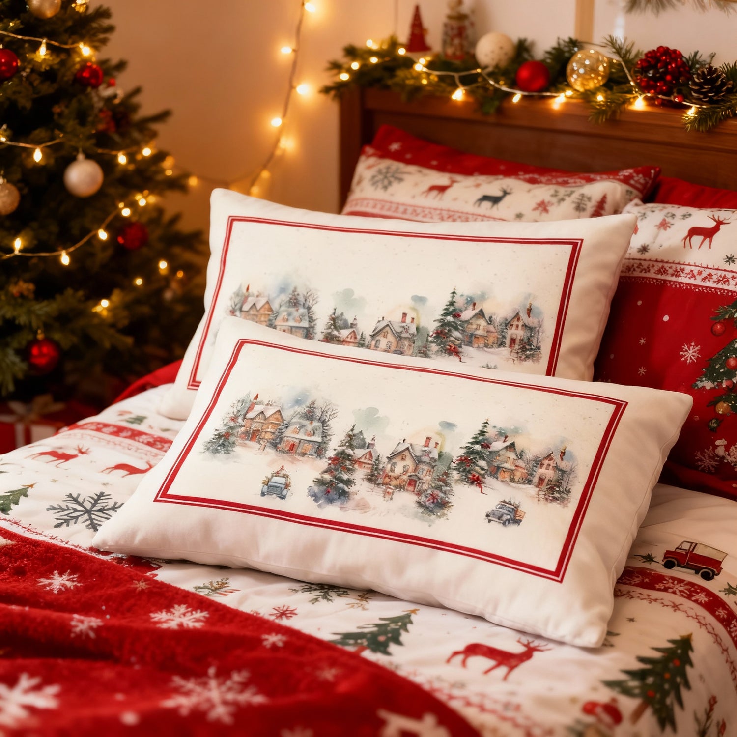 Coppia di federe in raso di puro cotone 200 T.C. La parte superiore delle federe è stampata con motivi natalizi, la parte inferiore è in raso tinta unita. Il prodotto viene consegnato in un’elegante scatola. Vesti la tua camera da letto di Natale con lo stile e la qualità inconfondibile di Tessitura Randi.