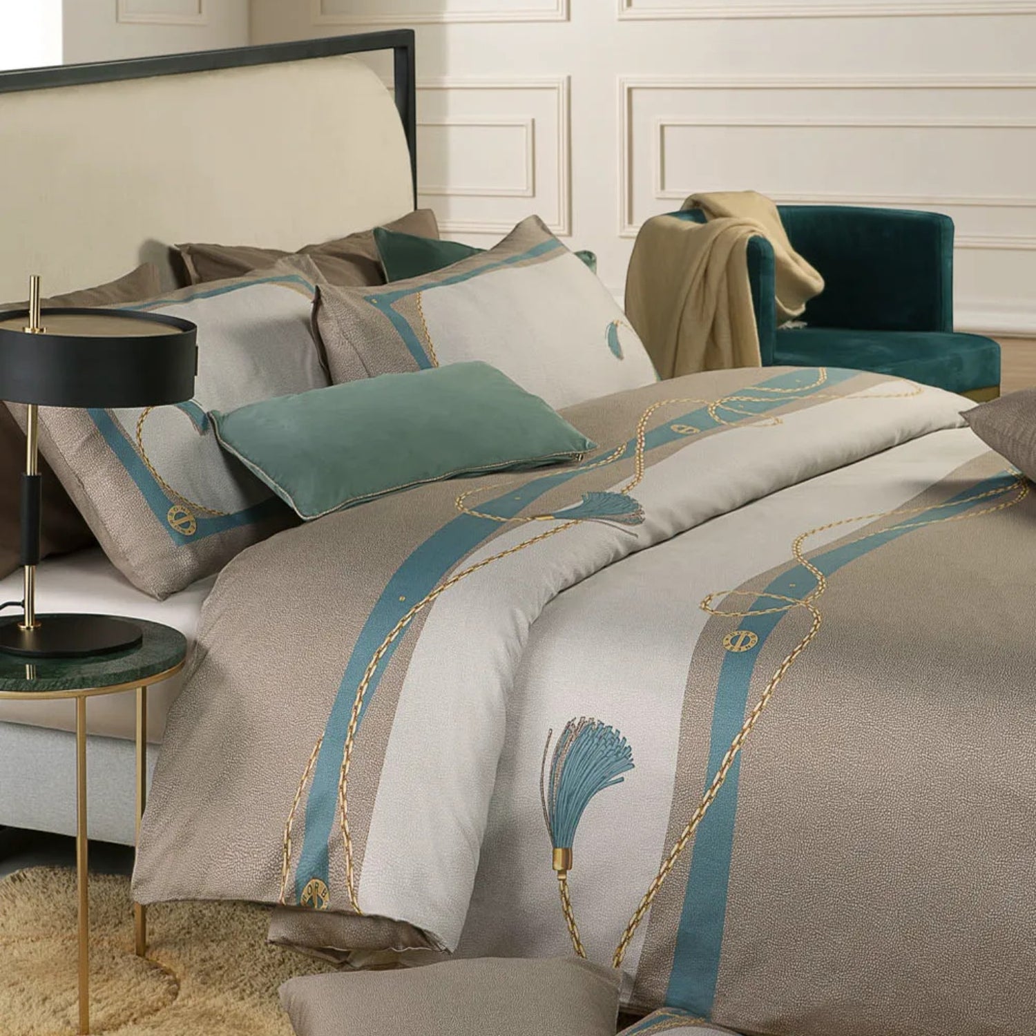 Completo copripiumino double-face in raso di puro cotone 300 T.C. La parte superiore della sacca e delle federe sono stampate con design personalizzato dall’iconica texture “OP” Occhio di Pernice; la parte inferiore della sacca e delle federe con motivo “OP” coordinato; il sotto con angoli è in tinta unita. Vesti di eleganza la tua casa, con l’esperienza di Tessitura Randi e il design iconico Borbonese.