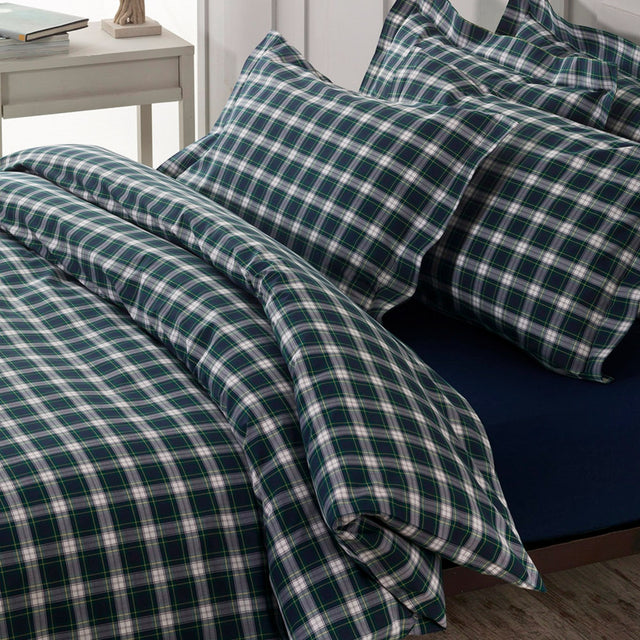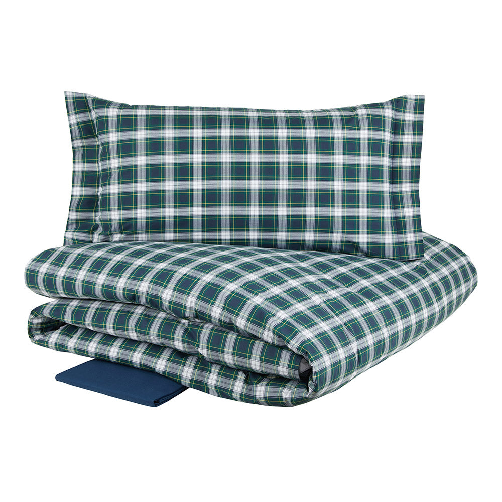 Completo copripiumino realizzato in percalle di cotone tinto filo 200 T.C. La sacca copripiumino e le federe a 2 volant sono in fantasia scozzese, mentre il lenzuolo sotto con angoli è in tinta unita. Vesti la tua camera da letto con lo stile e la qualità inconfondibile di Tessitura Randi.