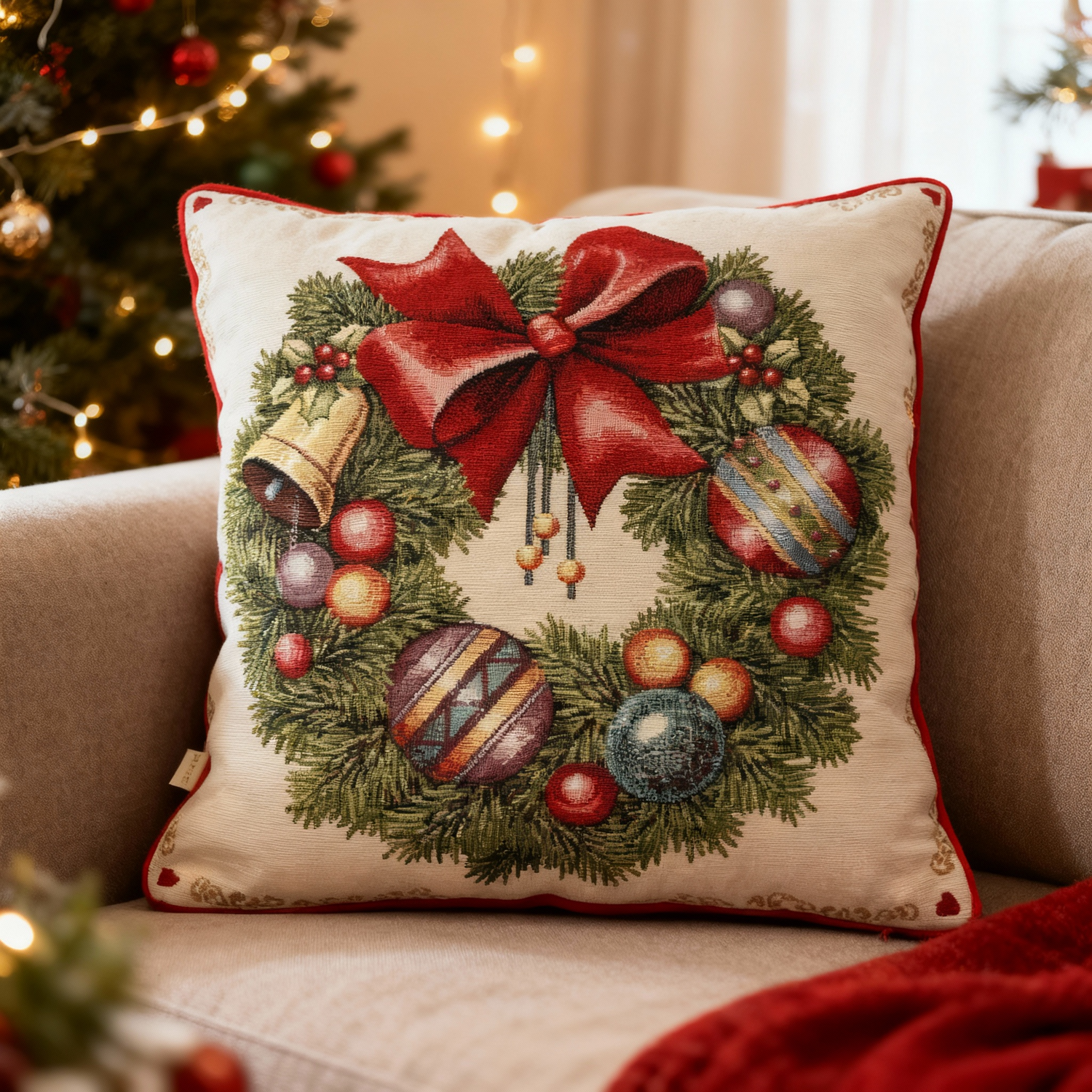 Decora la tua casa con il cuscino natalizio Karì, realizzato in pregiato tessuto Gobelin con filato Lurex che dona un tocco luminoso e festivo. Sfoderabile con zip, è completo di imbottitura in morbida fibra anallergica per il massimo comfort.